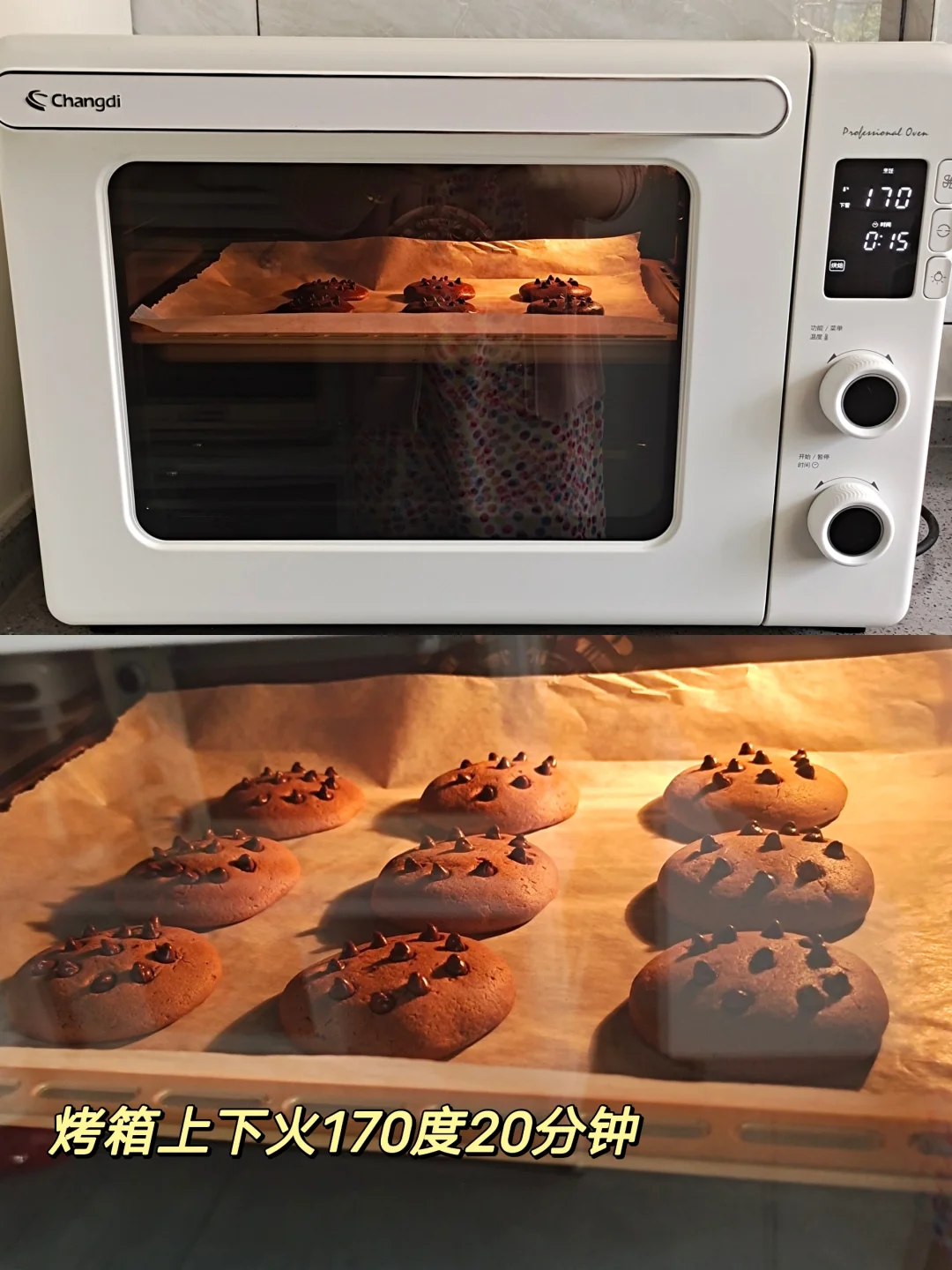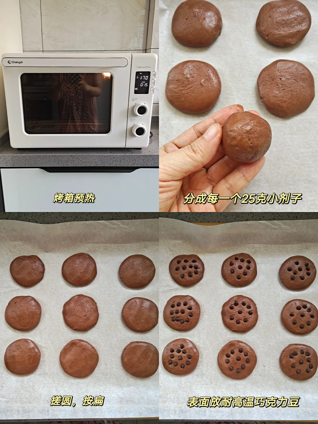 [四R]面团分成大概25克一个面团(做了9个),搓圆按扁,表面装饰耐高温巧克力豆,烤箱上下火170度20分钟。