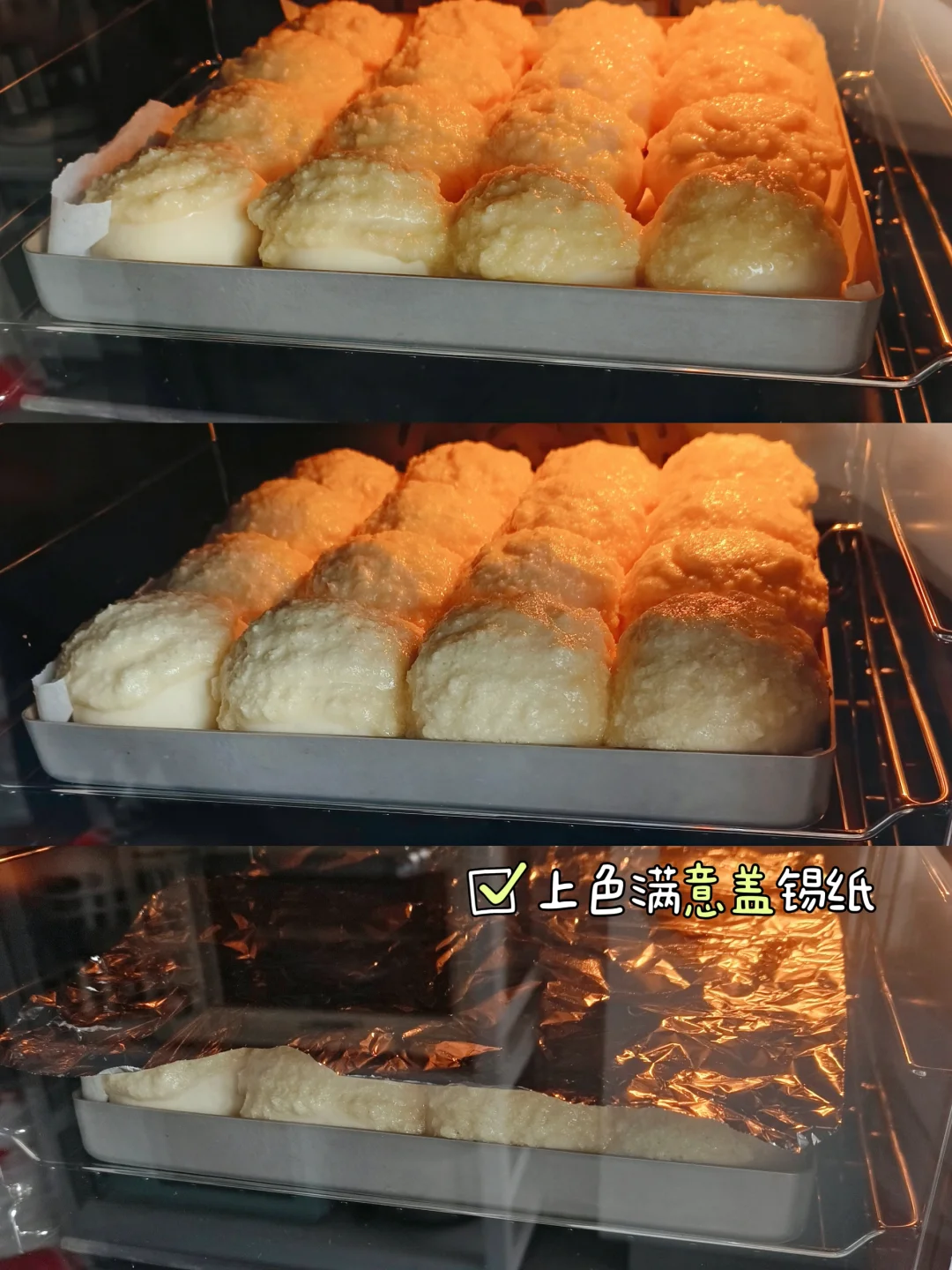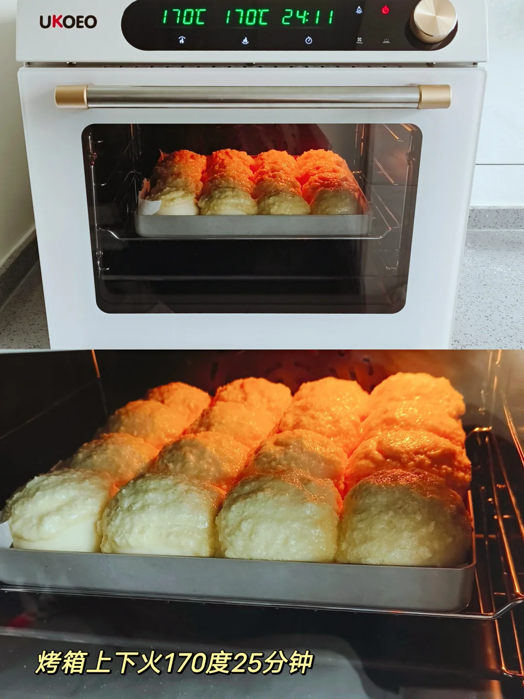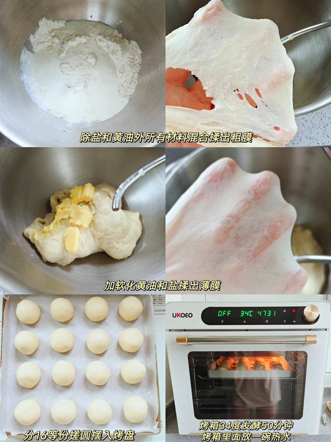 [二R]揉好的面团直接分16等份,搓圆,摆入烤盘,烤箱里面放一碗热水,34度发酵50分钟满盘,挤上椰蓉酱,烤箱170度25分钟。(中途上色满意盖锡纸)
