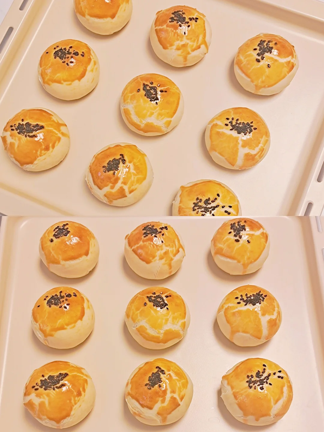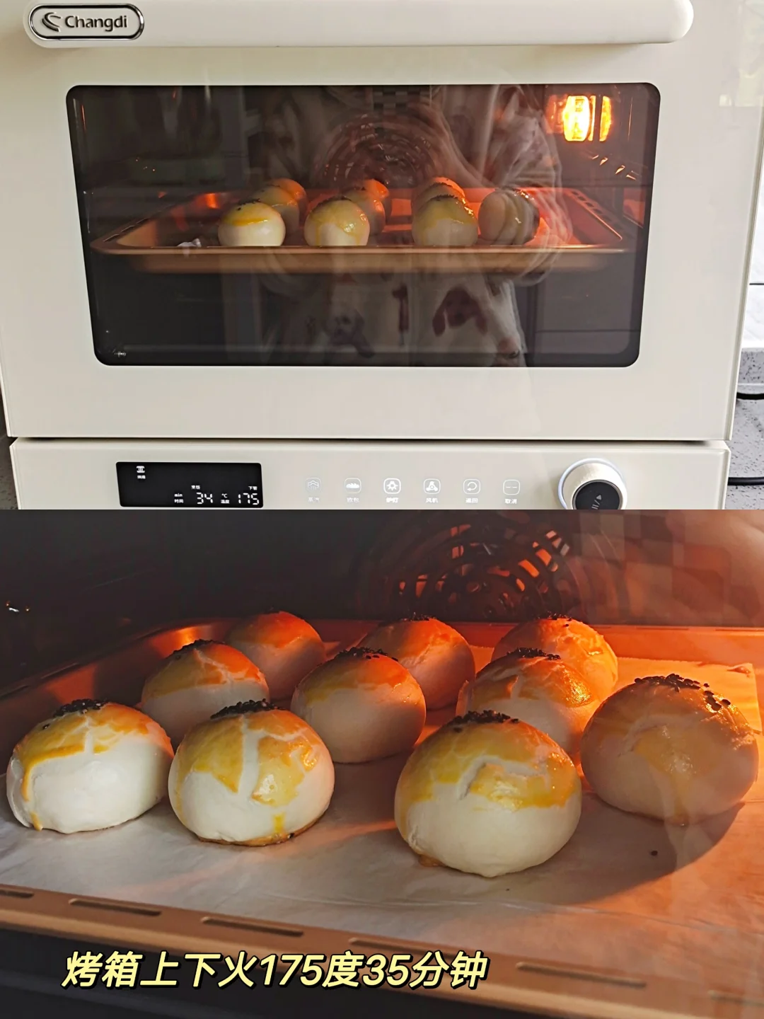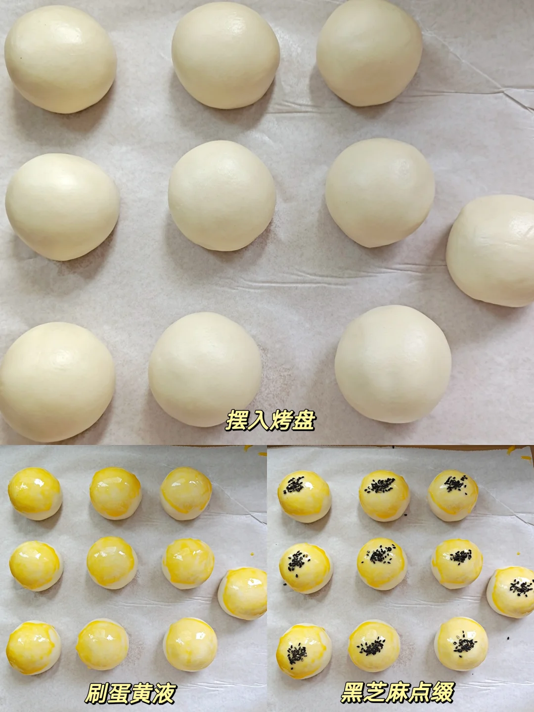[九R]刷蛋黄液,撒黑芝麻,烤箱175度预热,烤35分钟出炉。