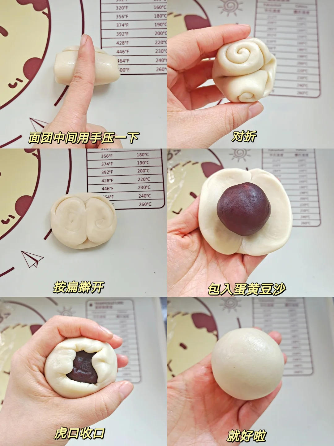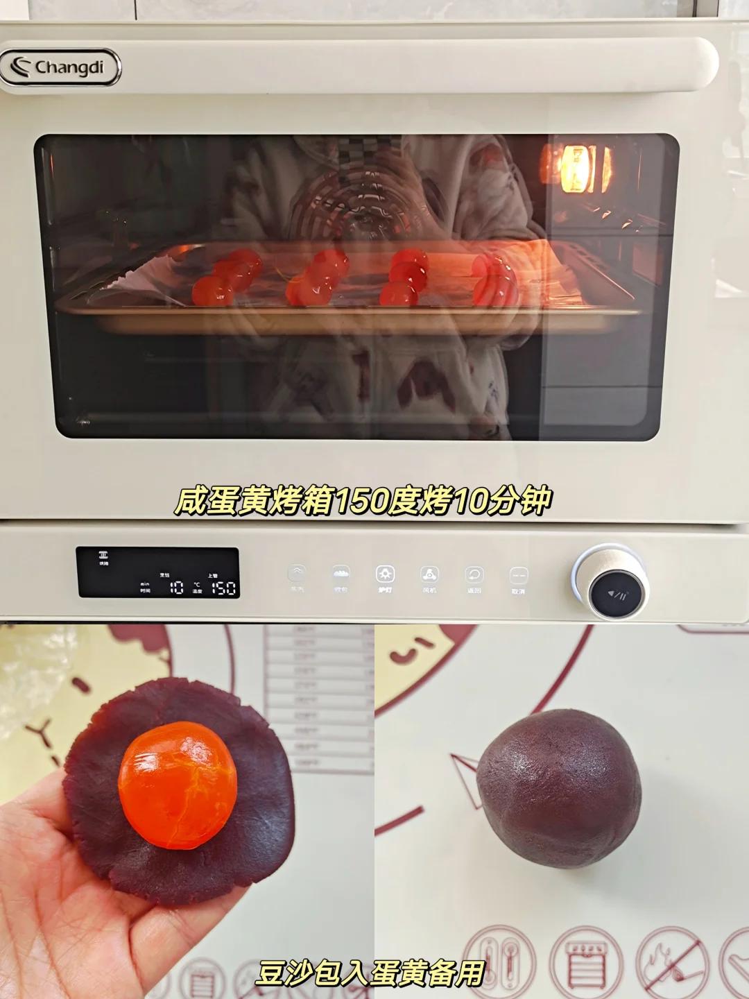 [三R]静置时间准备馅料,将咸蛋黄喷上高度白酒烤箱150度烤10分钟,250克豆沙分10份,每份25克。取等份豆沙包入咸蛋黄,捏紧收口,备用。