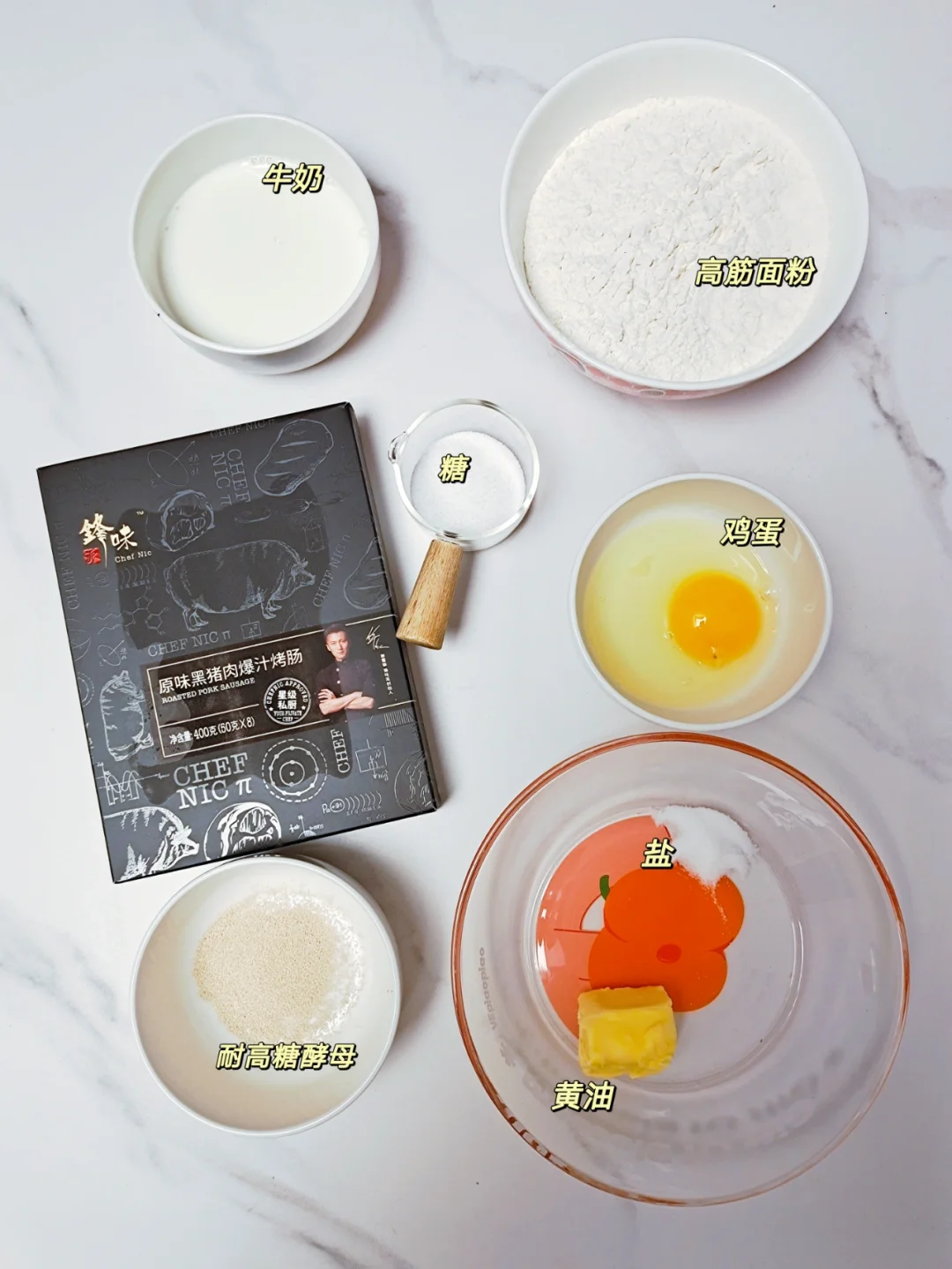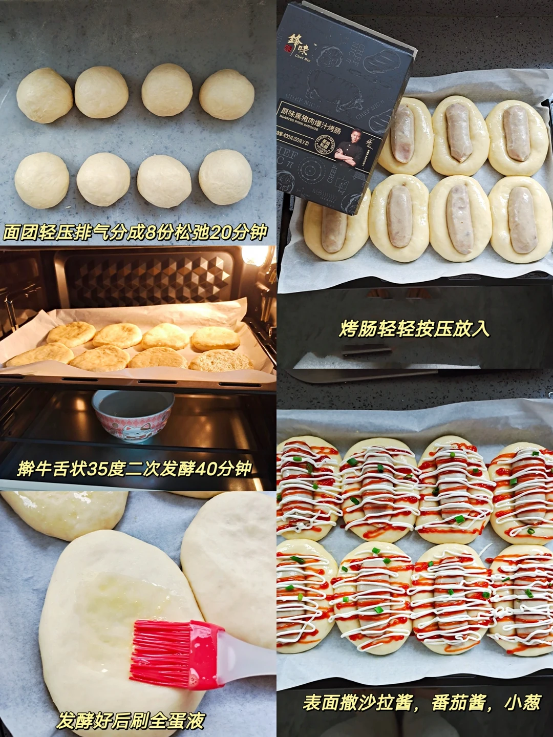 [彩虹R]高筋面粉250克,牛奶130克,耐高糖酵母3克,糖25克,鸡蛋1个(50克左右),黄油25克,盐3克,锋味派烤肠8根,沙拉酱,番茄酱,小葱适量。