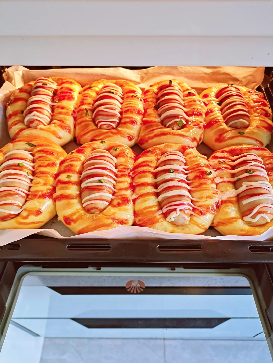 [三R]发酵好的面团放入烤肠,挤入沙拉酱,番茄酱,撒小葱,放入烤箱上火170度下火180度烘烤20分钟,出炉啦!