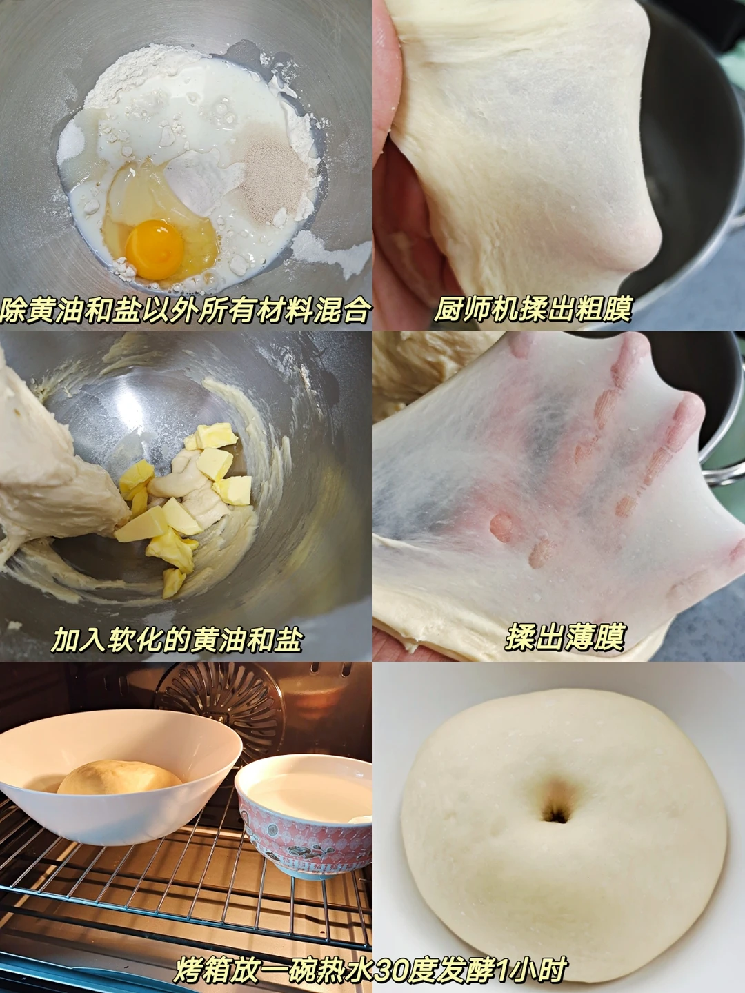 [一R]除黄油和盐以外所有材料混合,厨师机先2档2分钟揉至无干粉,转5档10分钟揉出粗膜,加入软化的黄油和盐继续5档10分钟揉出薄膜,放入烤箱30度发酵1小时。