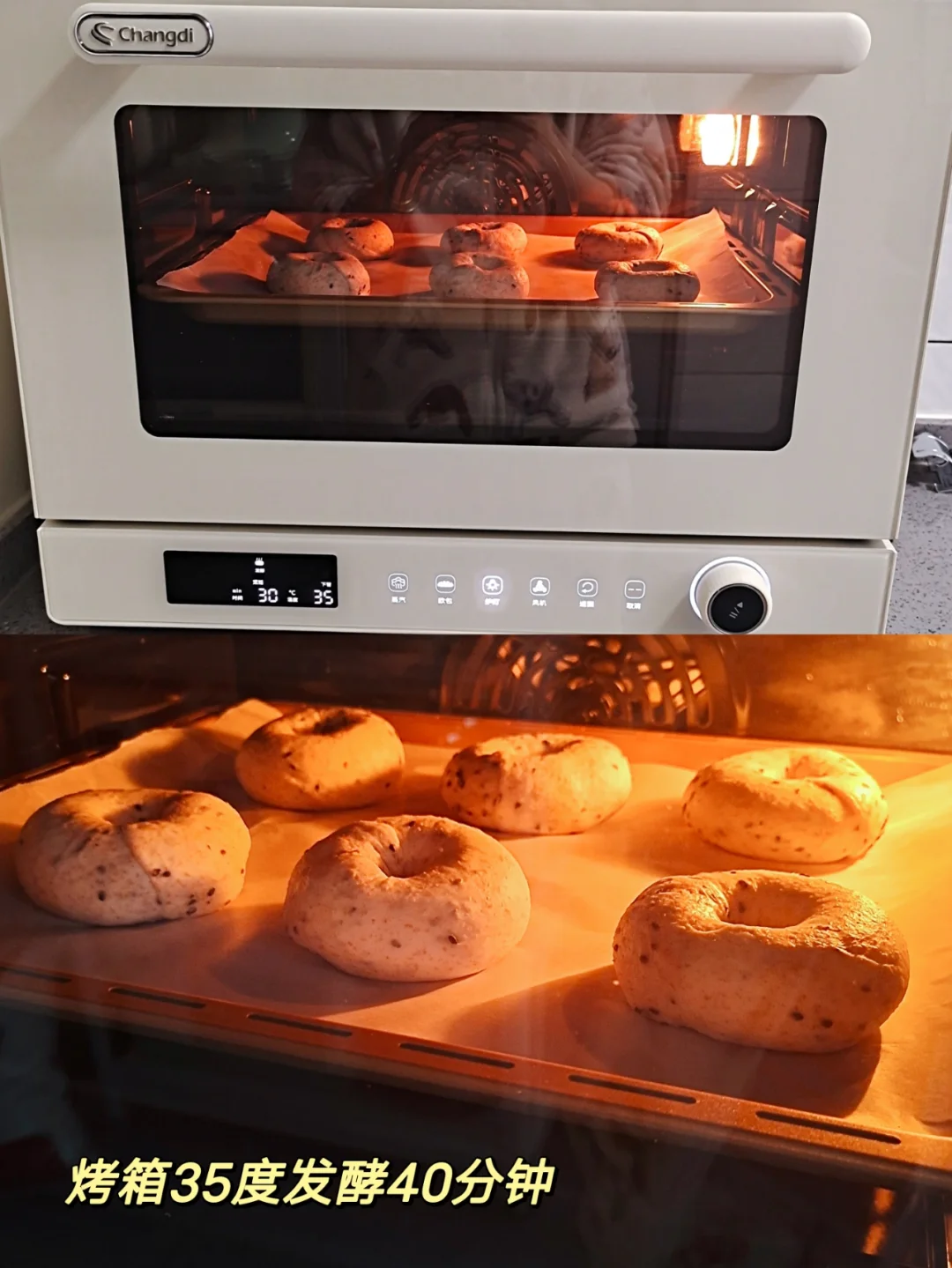 [四R]整形好的贝果放入烤箱发酵,35度40分钟,烤箱里面放一碗热水增加湿度,发酵到2倍大。
