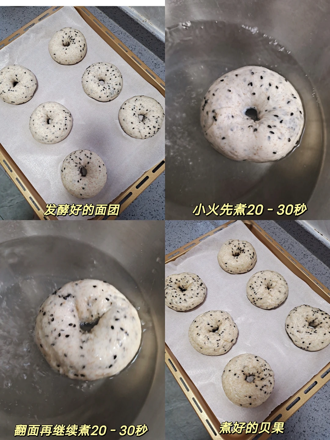 [五R]锅里放500毫升水,25克糖,煮开关小火,正反面各煮20-30秒捞出,烤箱上下火200度烤23分钟,刚煮好的贝果表面是抽抽的,放入烤箱后立马就嘭起来了。
