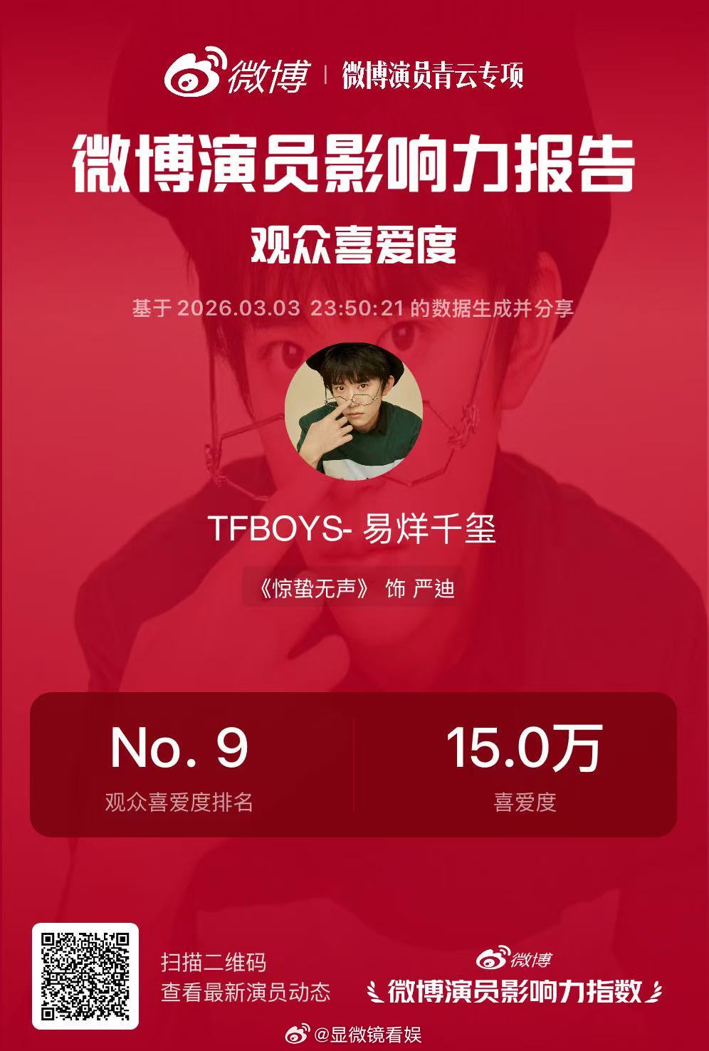 易烊千玺严迪观众喜爱度破15万 🎉严迪观众喜爱度突破15万!易烊千玺用扎实的表演功底诠释严迪的角色内核,每一处细节都拿捏到位,喜爱度上涨是观众对角色演绎的真实反馈✨未来继续为演员易烊千玺打call~戳👉微博演员影响力指数 微博演员影响力