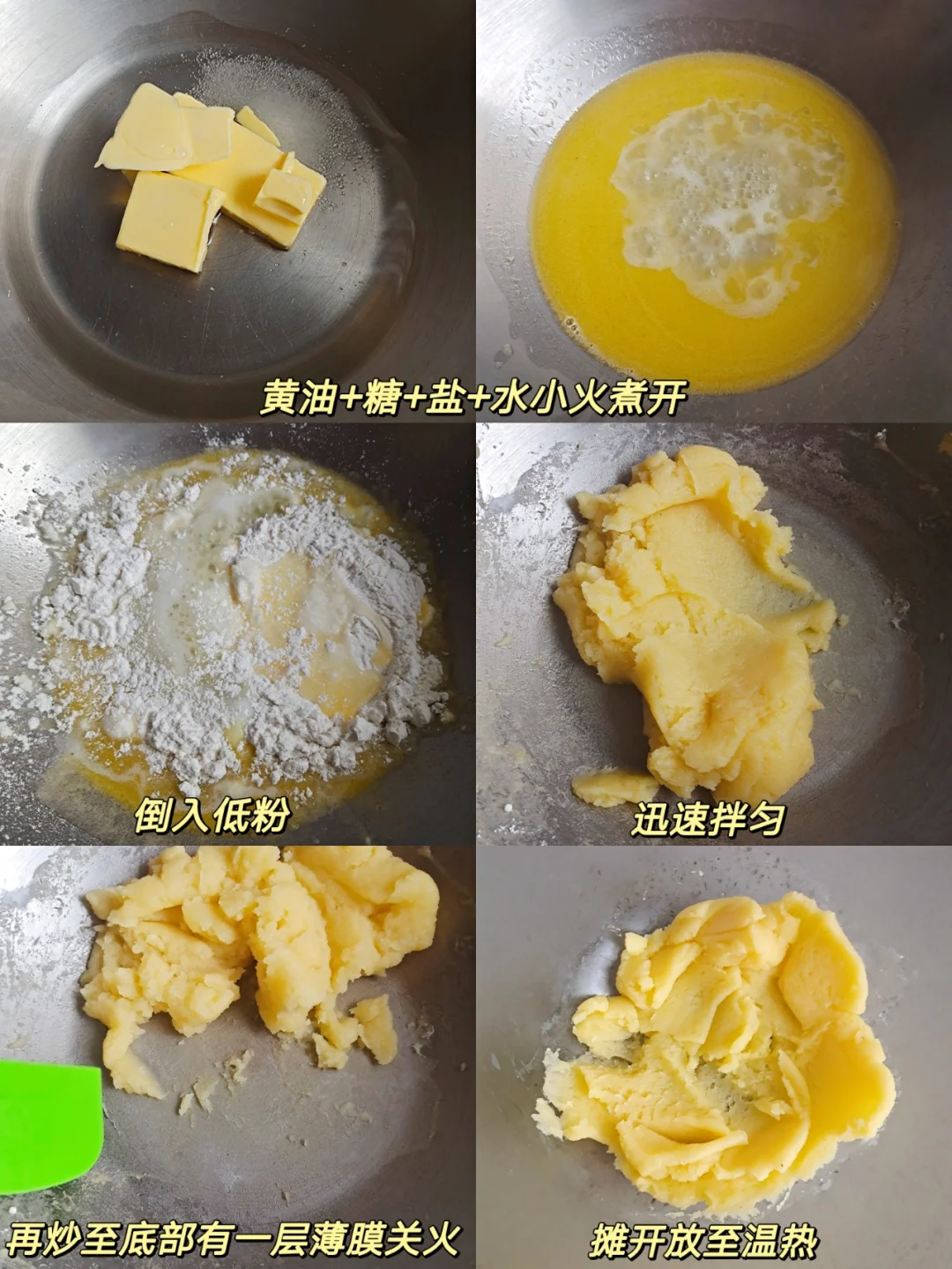 [一R]将黄油,盐,糖,水混合,小火煮开沸腾,加入低粉(提前过筛)面粉迅速拌匀,炒至底部有一层薄膜关火。(如果用不粘锅,那就大概炒1分半),倒入盆里摊开晾至温热。