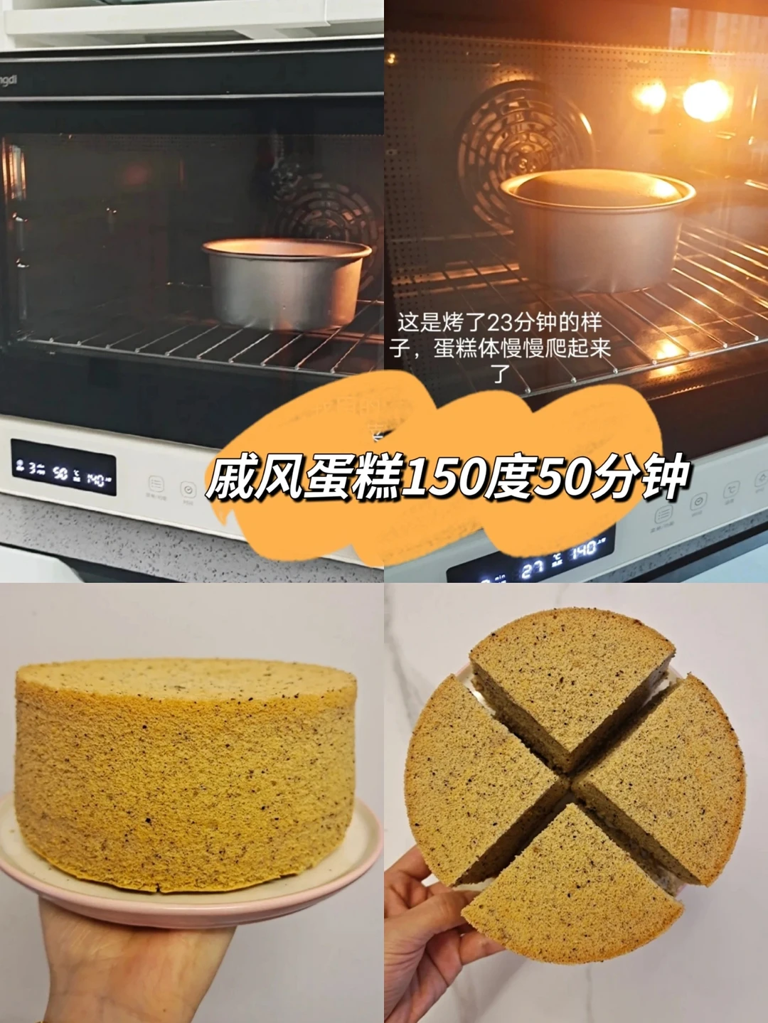 [黄色心形R]开箱后的第1款甜品,烘烤了最经典的戚风蛋糕,毕竟“气疯蛋糕”对温度要求很高,我是150度50分钟,这样烤出来的戚风不凹底,不缩腰关键是入口不会干噎,云朵戚风,非常松软。