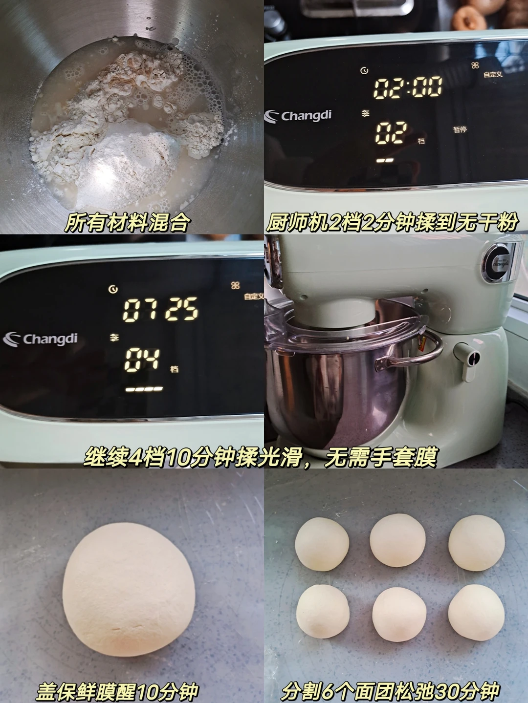 [一R]所有材料混合,长帝小奶猪双刀厨师机2档2分钟揉至无干粉,转4档10分钟揉至光滑即可,盖保鲜膜醒10分钟,拥有一台好的厨师机真是事半功倍,解放双手。