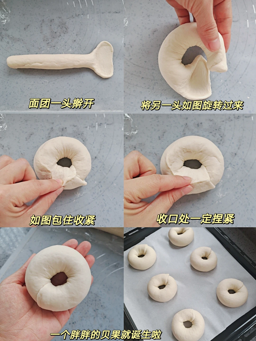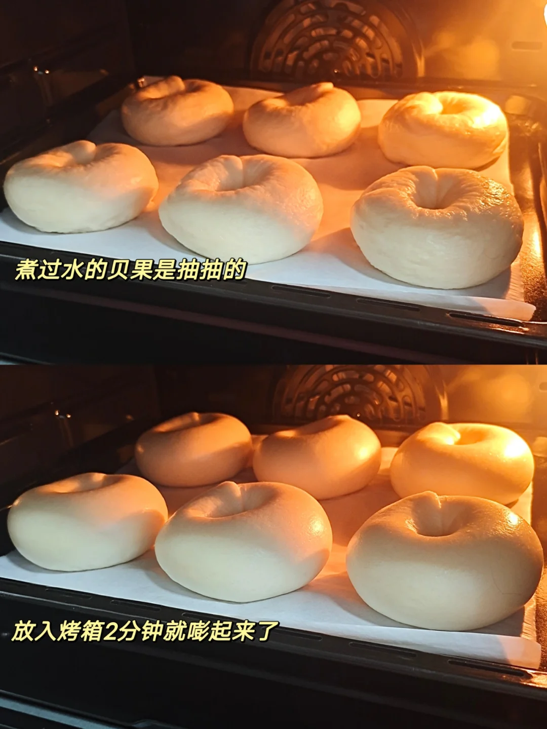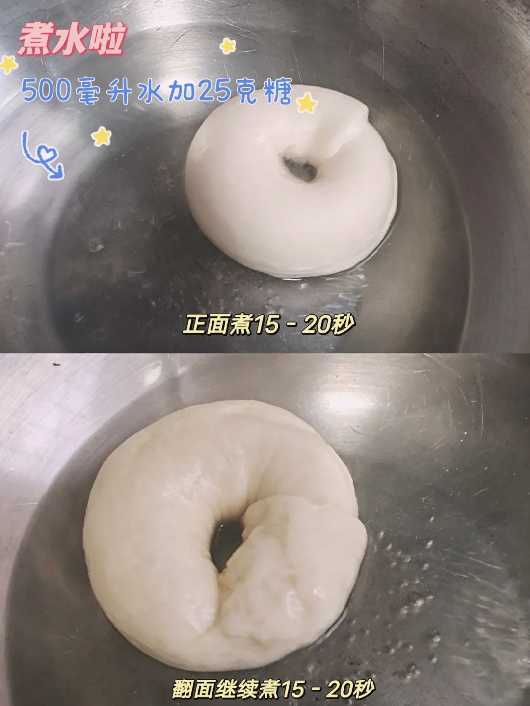 [五R]锅里放500毫升水,25克糖,煮开关小火,放入贝果正反面各煮15-20秒捞出。烤箱上火220度下火200度烤18分钟。刚煮好的贝果表面是抽抽的,放入烤箱后就会嘭起来哦~