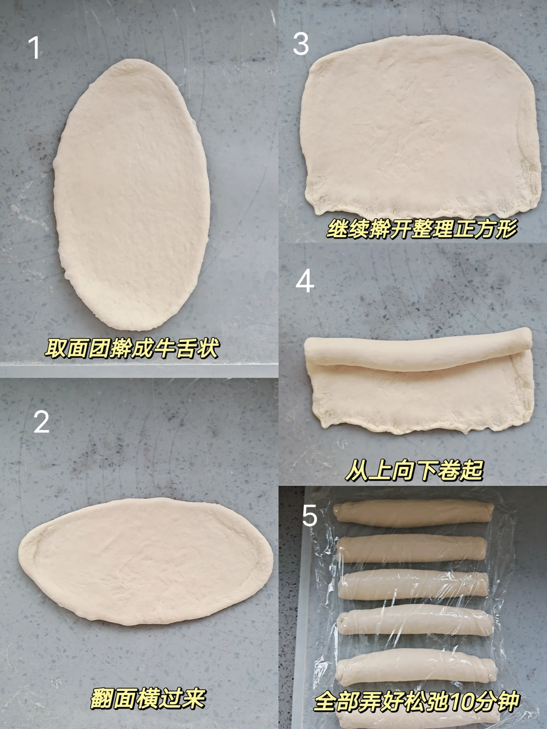 [三R]取一个面团排气擀成牛舌状,如图翻面横放,整理成长方形,从上向下卷起,收口处捏紧哦,所有整理好后松弛10分钟。将一头用擀面杖擀开,另外一头旋转如图所示,所有的收口处都要捏紧哦~