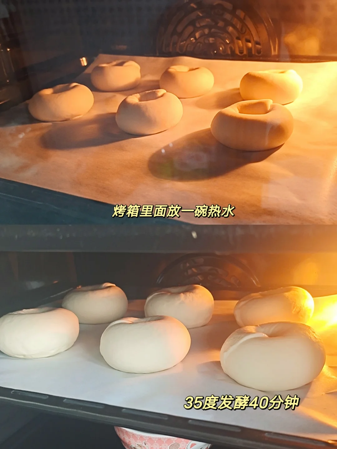 [四R]整形好的贝果放入烤箱发酵,35度40分钟,烤箱里面放一碗热水增加湿度,发酵到2倍大。