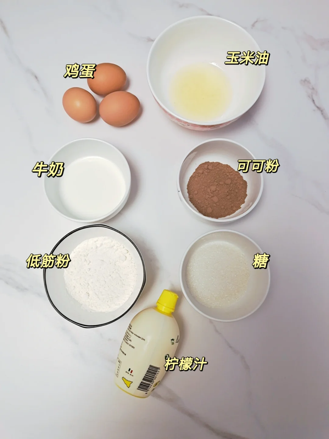 [彩虹R]鸡蛋3个(一个大概55-60克),玉米油30克,牛奶45克,低筋粉45克,糖35克,可可粉8克,柠檬汁几滴。(这个方子我做了10个,挤的都是8分满)