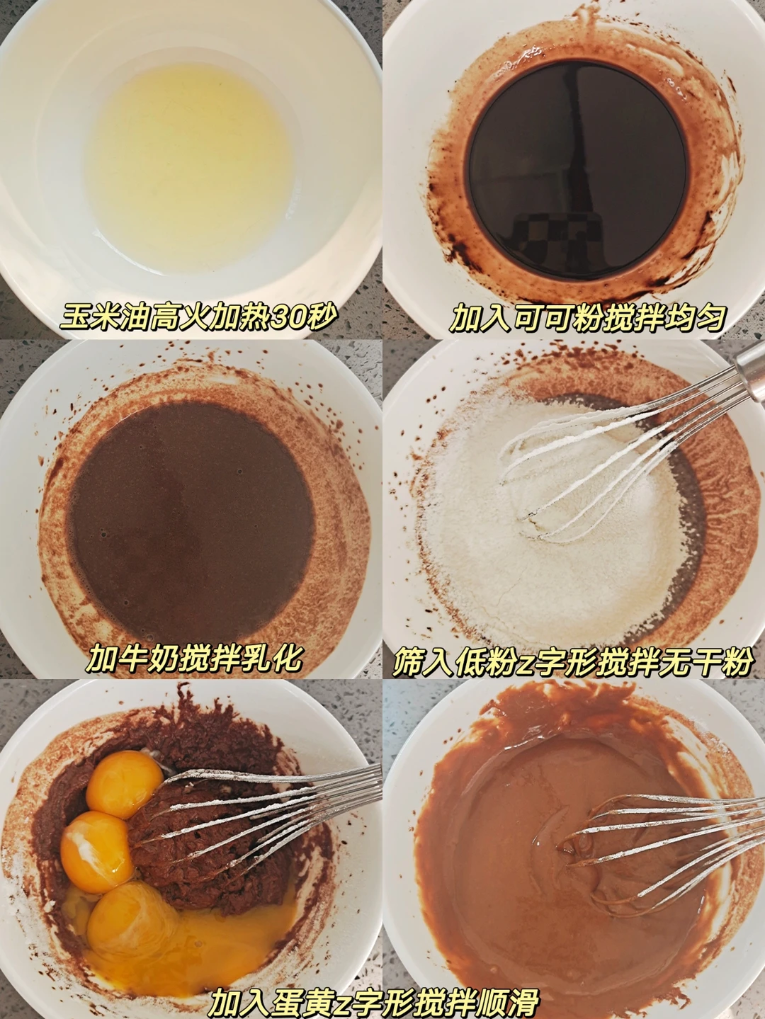 [一R]玉米油用微波炉高火加热30秒,加入可可粉搅拌均匀,再加牛奶搅拌乳化,筛入低筋粉z字形搅拌无干粉,再加入蛋黄z字形搅拌顺滑。