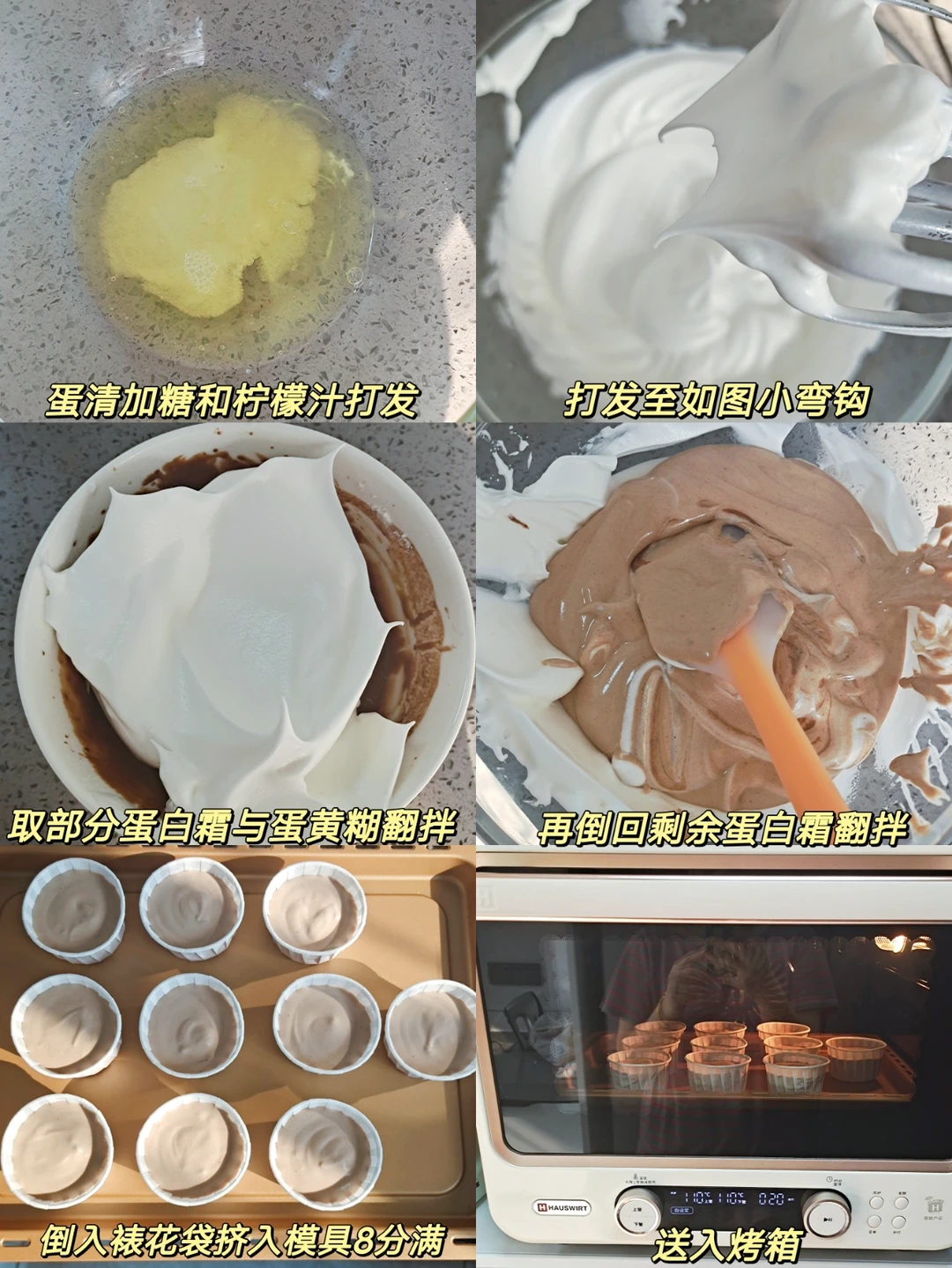 [二R]烤箱110度预热。蛋清加糖和柠檬汁打发,中速打发出现纹路,转低速继续慢慢打发,直到打蛋头出现如图小弯钩,取三分之一蛋白霜与蛋黄糊翻拌均匀,再倒回剩余的蛋白霜里面继续翻拌均匀,装入裱花袋,挤入纸杯模具8分满。