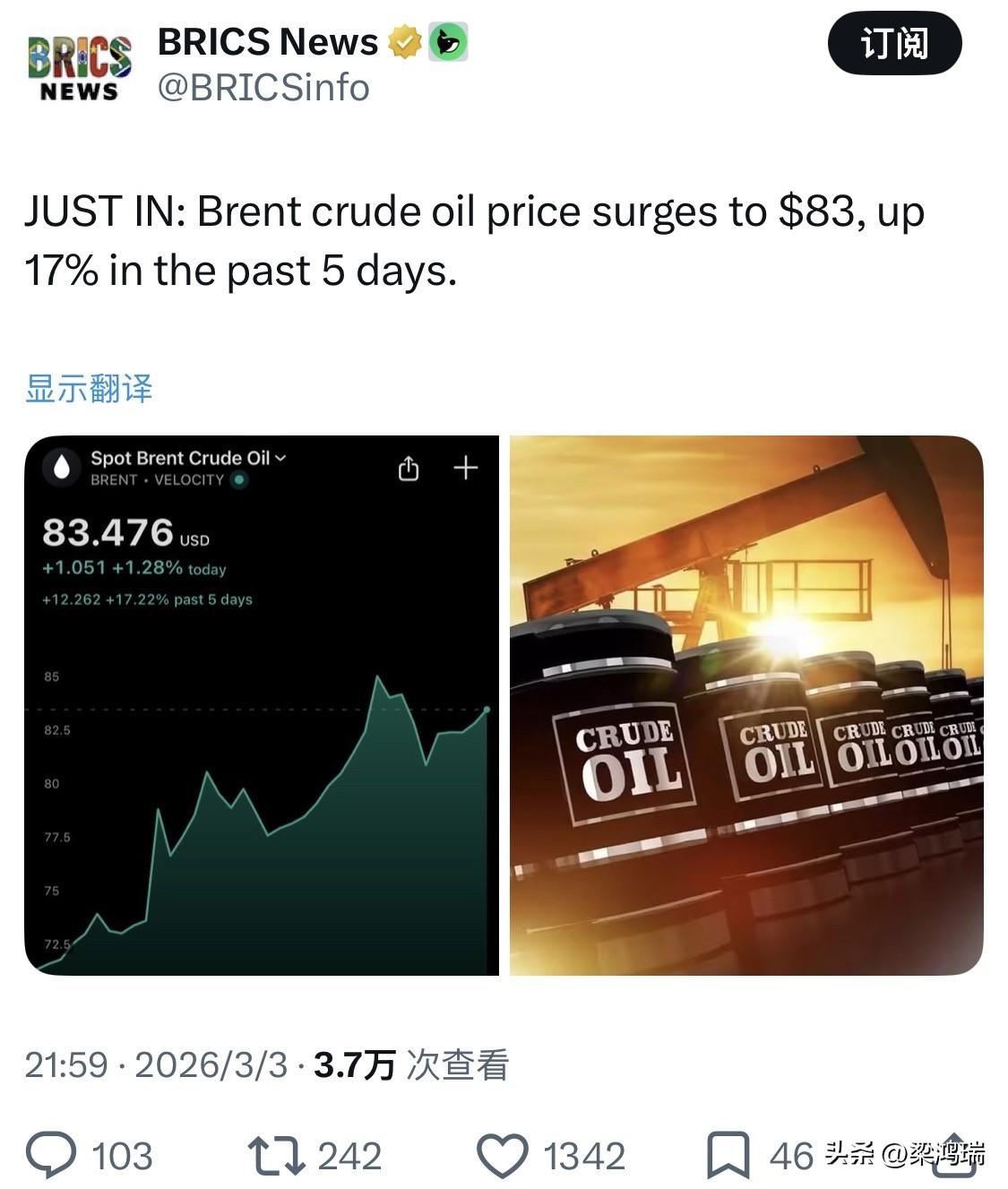 最新消息:布伦特原油价格飙升至每桶 83 美元,过去 5 天上涨了 17%。