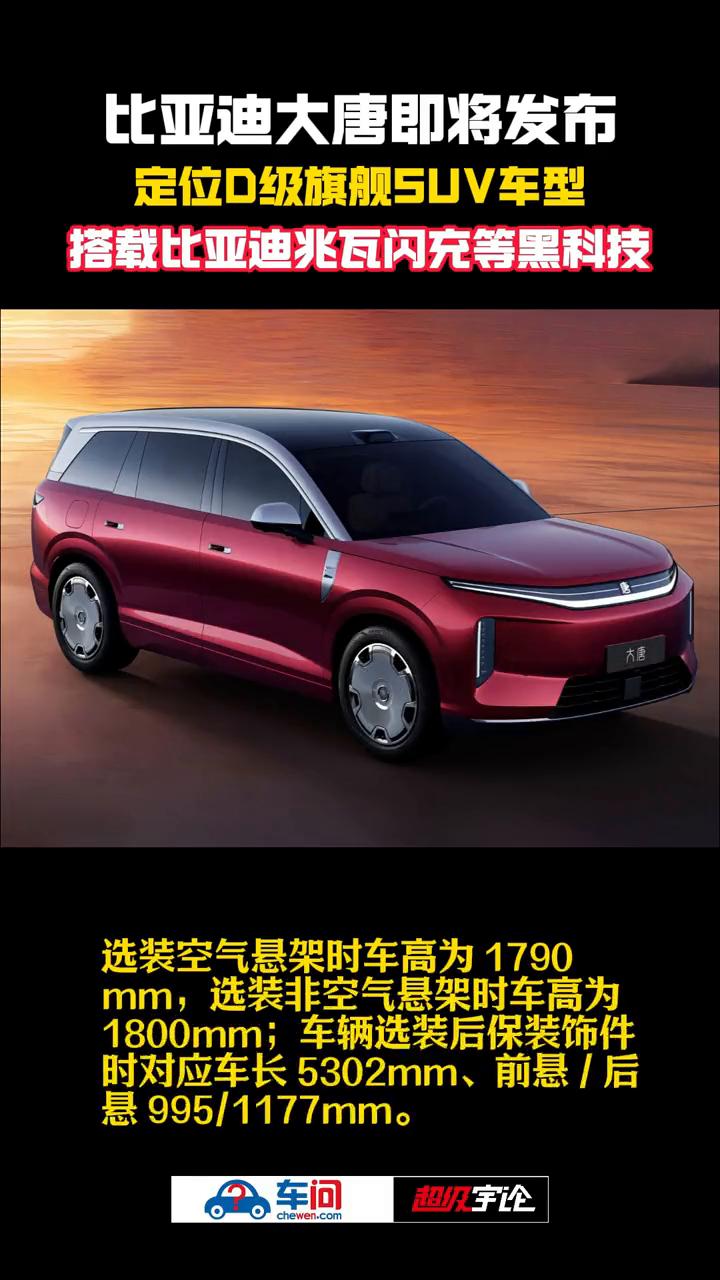 比亚迪大唐即将发布定位D级旗舰SUV车型,搭载比亚迪兆瓦闪充等黑科技。 超级宇论。 日前,比亚迪大唐内饰官图发布,新车将于3月5日发布,定位40万级别以上市场,搭载比亚迪兆瓦闪充等黑科技。内饰设计整体延续唐L的设计思路,但在座椅舒适性上提升到新的高度,采用6座布局。 这款车型标配全景天幕,可选装前保黑色装饰条、扰流板、后保装饰件、轮辋、黑色套件、银色套件、同门把手。选装空气悬架时车高为1790mm,选装非空气悬架时车高为1800mm;车辆选装后保装饰件时对应车长5302mm、前悬/后悬995/1177mm。 大唐纯电版搭载比亚迪超级e平台,采用全域1000V高压架构,配合10C充电倍率的闪充电池和1000A充电电流,预计最高可实现1000kW的充电功率。 内饰方面,大唐内饰采用了全新的三屏设计,包括全液晶仪表屏、悬浮式中控屏和副驾娱乐屏,同时还具备抬头显示。内饰延续唐L汲取中国古代建筑设计灵感的多面设计,当引入了木质纹理装饰,更显温馨,全新的配色也更显高级感。 第二排配备了更加舒适的独立座椅,一体式腿托,菱形的缝线提升了高级感,座椅支持一键躺平功能。二排提供大尺寸的折叠屏、小桌板和车载冰箱。第三排座椅也可以电动调节,并拥有座椅加热功能。