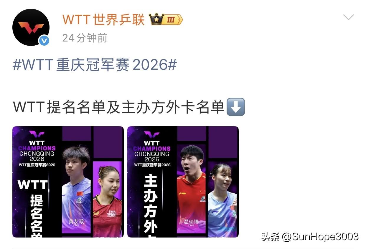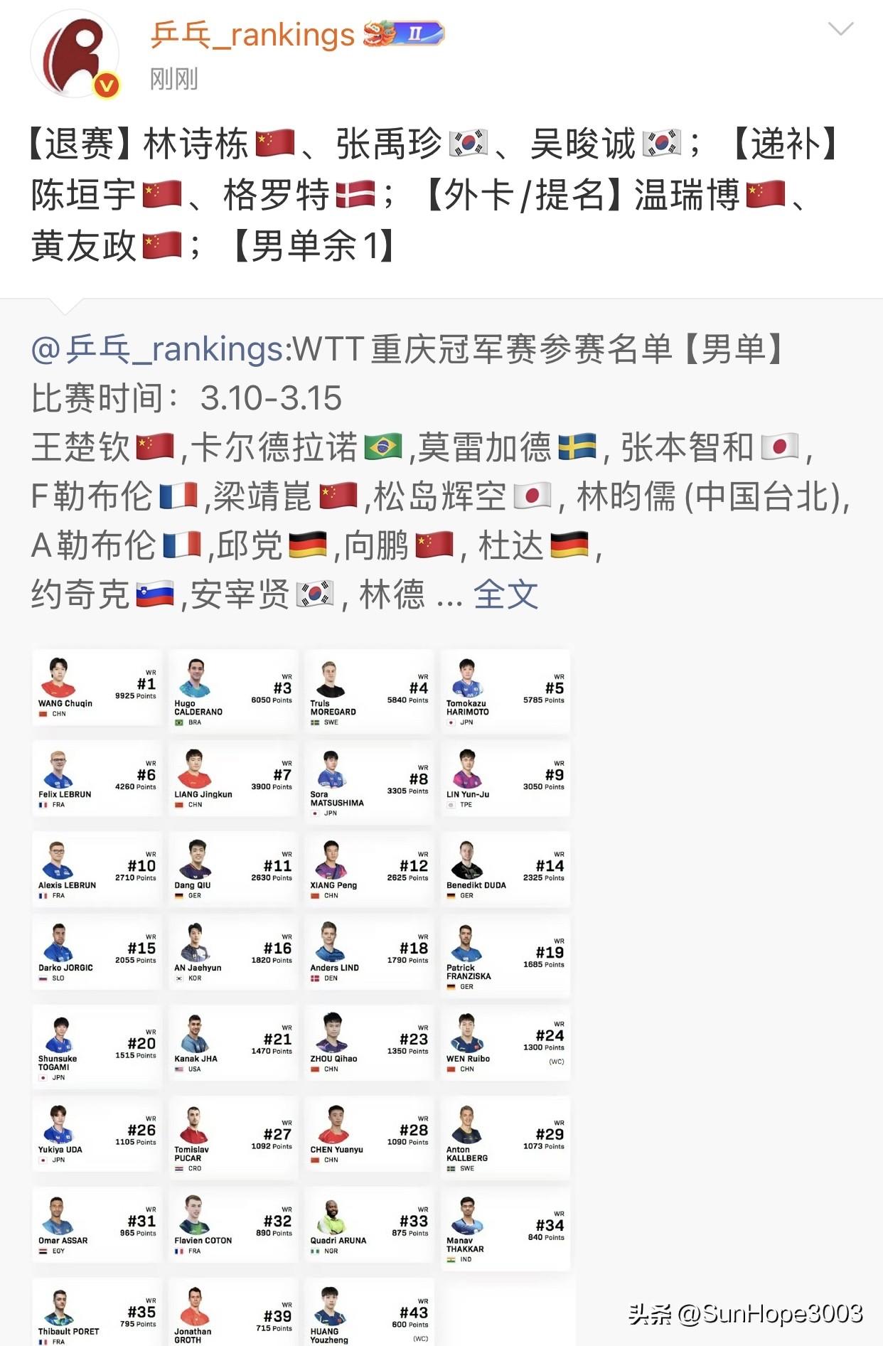 林诗栋退赛,陈垣宇递补,另外黄友政,温瑞博,石洵瑶拿到外卡。 重庆冠军赛即将在10号开赛,仍然是孙颖莎王楚钦领衔, 刚刚官网显示林诗栋已经退赛,还有其他球员的递补和外卡信息, 林诗栋这一年多,没有单打冠军入账,教练组可能是希望他休息调整一下, 升级自己的技术体系,在澳门世界杯发力。 林诗栋重庆冠军赛不参加,积分将会至少掉到第五,没有自己的1/4区了, 下一次比赛,要随机掉落,可能会和队友提前遇到, 但是要想升级自己,就需要花时间,怎么都得有个取舍。