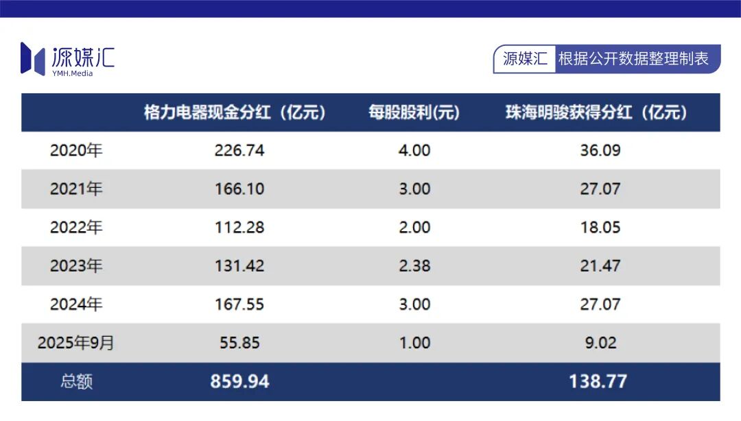 2020年至今,格力电器开展现金分红合计约859.94亿元,其中珠海明骏获得税前分红约138.77亿元。