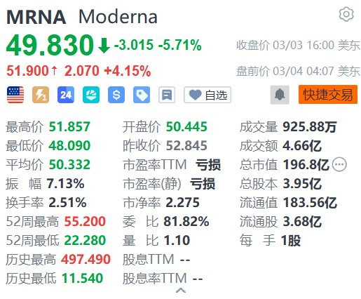 Moderna(MRNA.US)盘前涨4.15%,报51.9美元。消息面上,Moderna表示同意支付9.5亿美元,以和解与ArbutusBiopharma和GenevantSciences就该公司现有和未来疫苗在全球范围内的所有诉讼,并且不再支付任何未来的特许权使用费。公司又称,如果联邦巡回上诉法院确认其责任,将在90日内额外支付最多13亿美元。随着专利阴云逐渐消退,以及与OpenAI深度合作的Moderna试图将AI深度嵌入mRNA药物研发与运营体系的增长叙事主线,市场正在将“mRNA平台+前沿AI能力”定价成Moderna下一阶段股价主升浪的核心催化剂。(格隆汇)