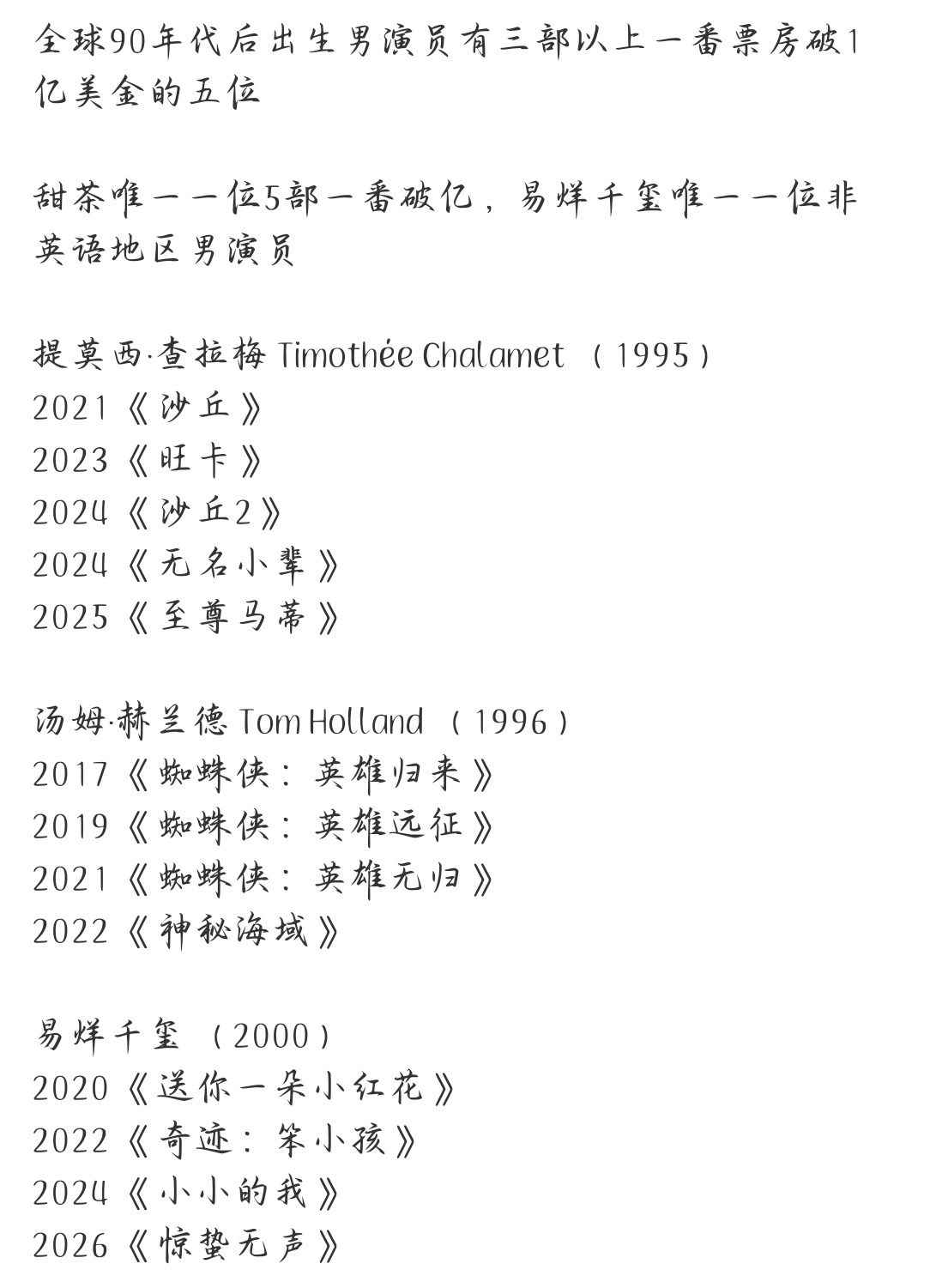 而且易烊千玺还是这群人里面唯一一个没有大IP没有123续集,一部一个角色,一步一