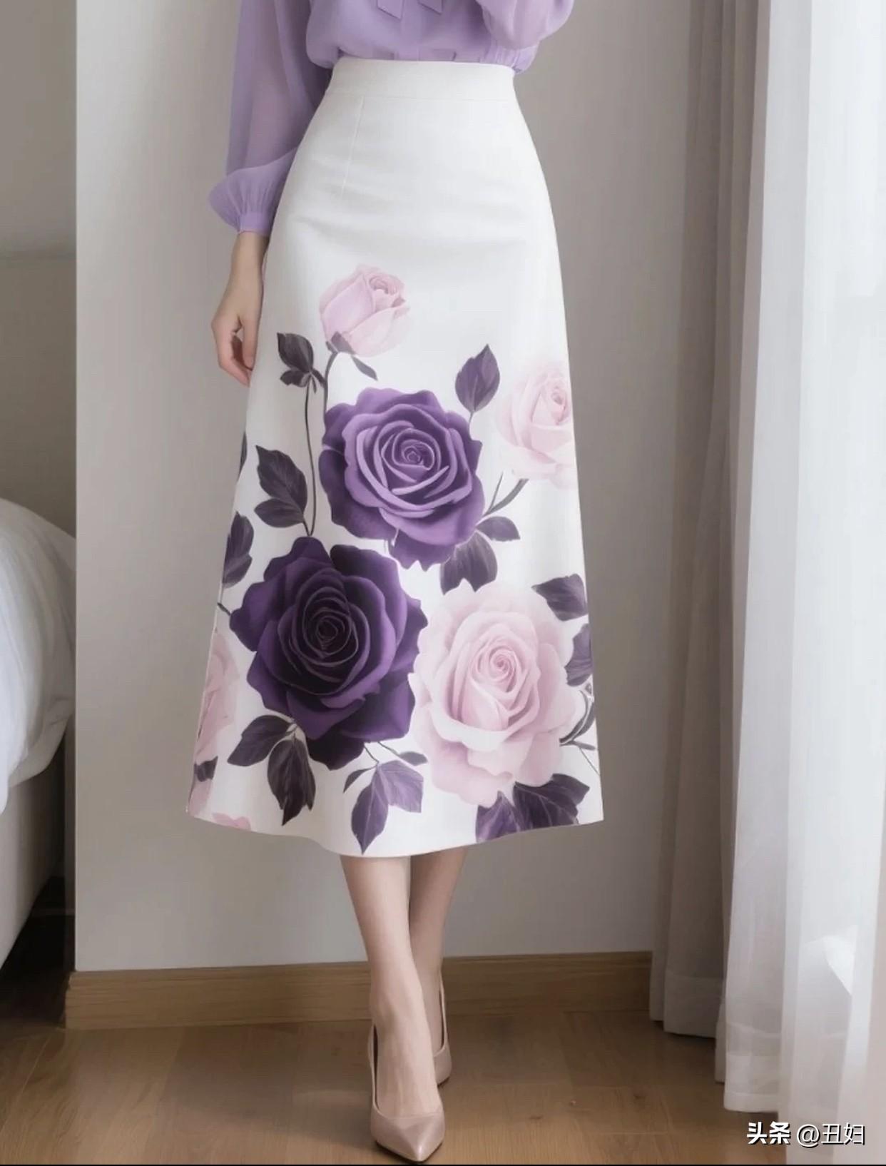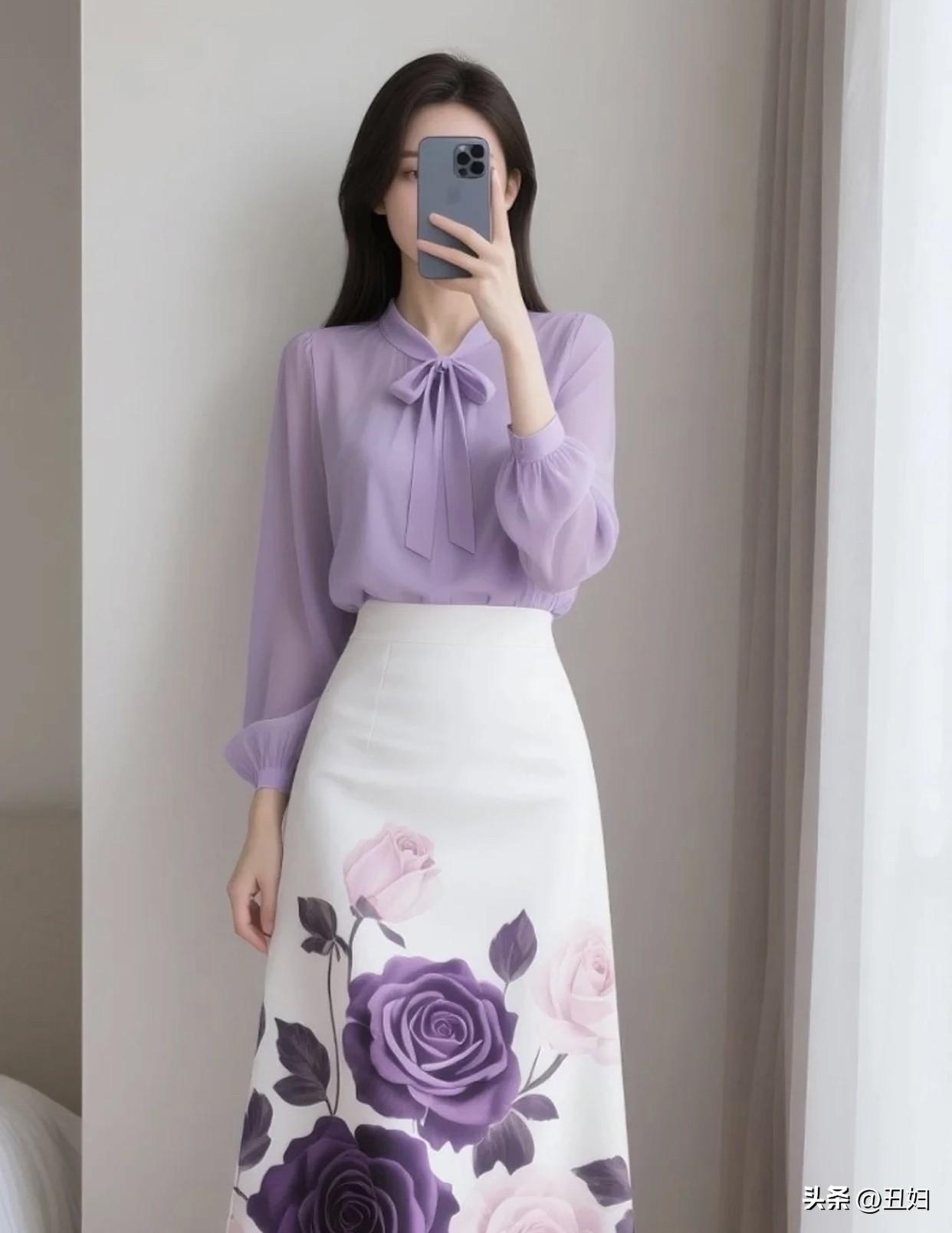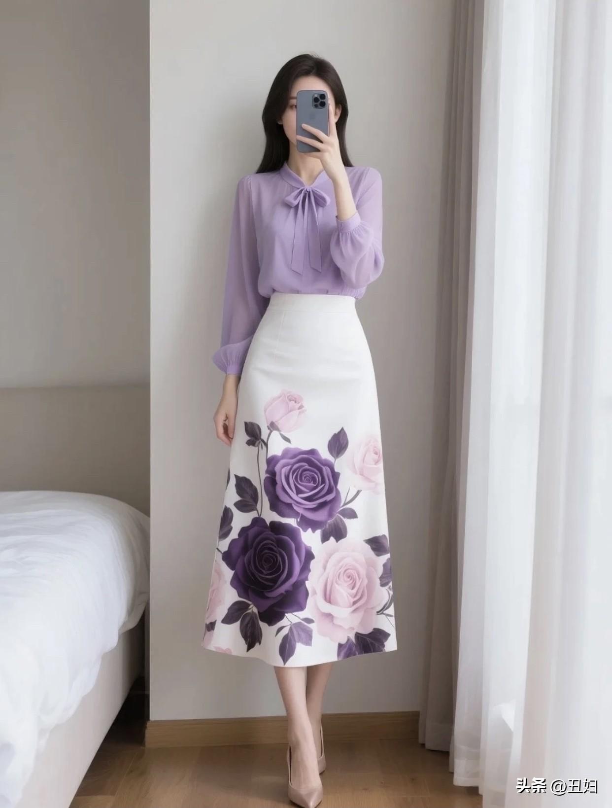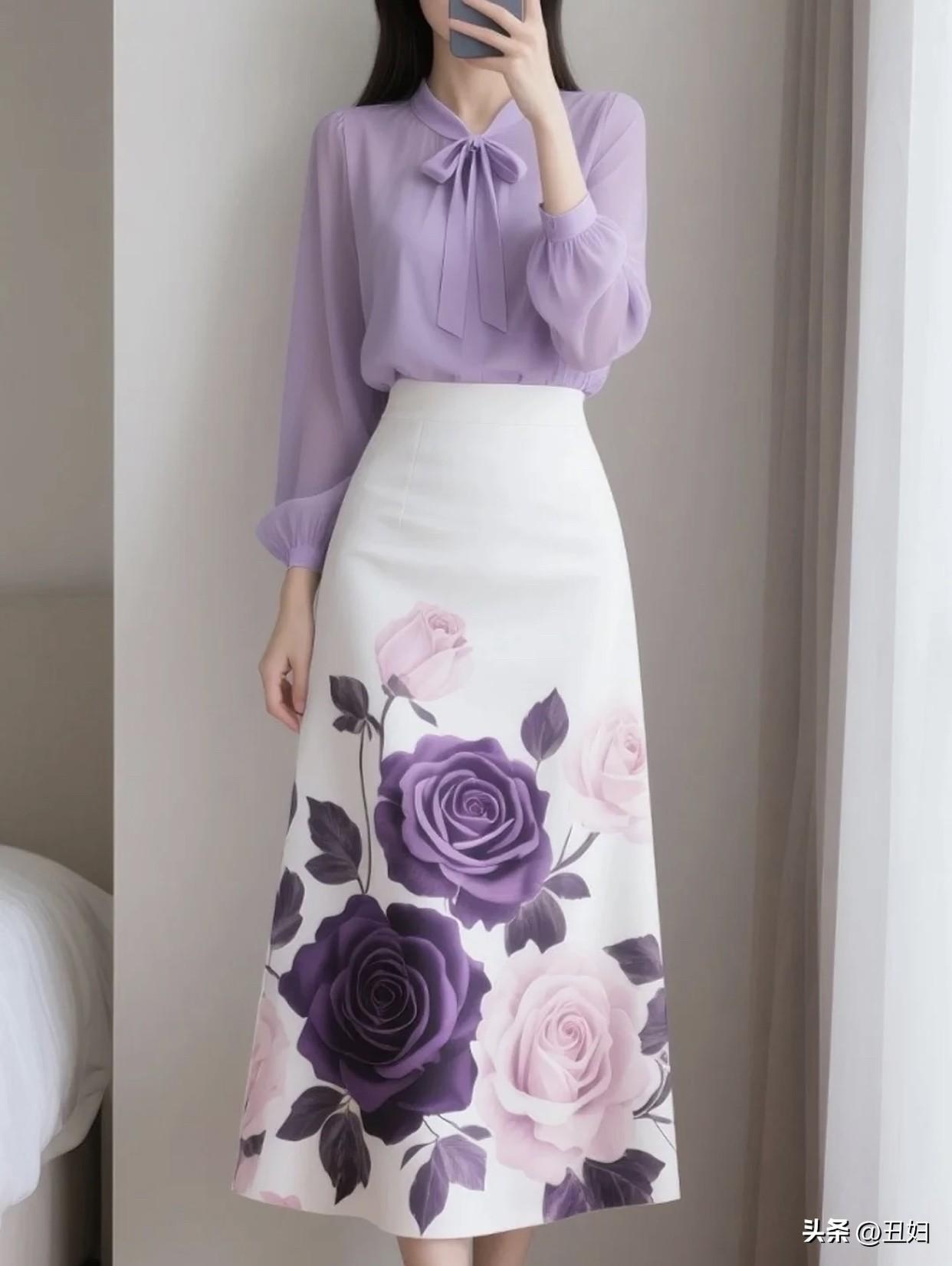 如何穿搭显得淑女一点优雅紫色蝴蝶结衬衫搭配浪漫花卉裙,完美穿搭!
