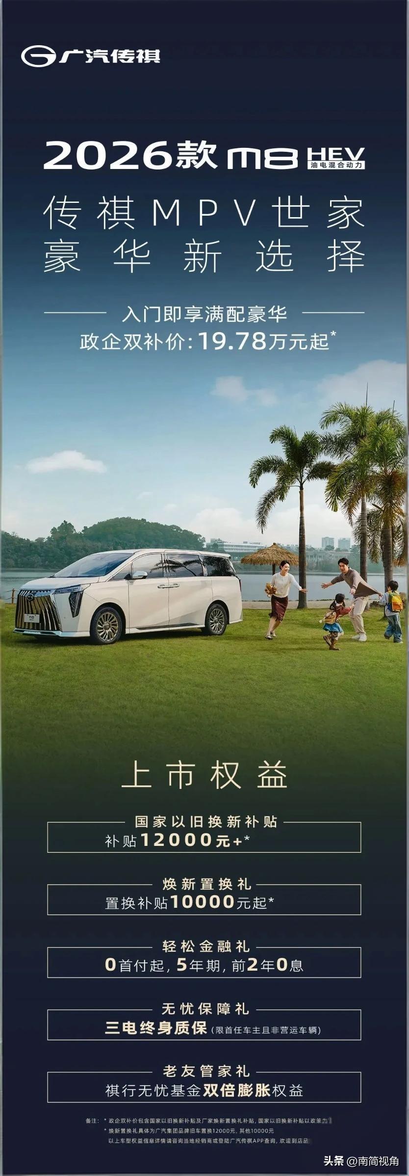MPV市场真的变天了!2026款传祺M8 HEV政企双补后,19.78万就能拿下入门尊贵版。 面对这个实惠的价格,我们只需要算一笔账: 1. 对比合资: 比丰田赛那便宜超6万,比别克GL8入门版便宜5万+,配置却全是满配。 2. 对比价值: 尺寸拉满(5212mm车长),混动系统WLTC油耗仅6.15L,没有充电焦虑。 3. 看稳靠谱: 累计销量超80万,三年保值率领跑自主,技术和口碑都是硬通货。 在这个“技术内卷”的时代,中国品牌已经不再是“便宜没好货”的代名词。花轿车的钱买商务舱的享受,这才是2026年最明智的出行选择!