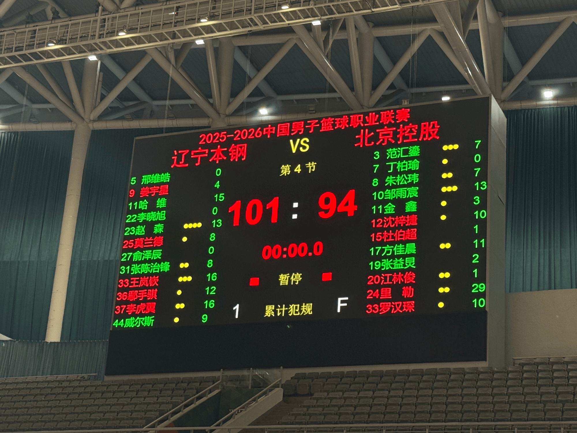 最终,辽宁男篮以101-94战胜北控男篮。