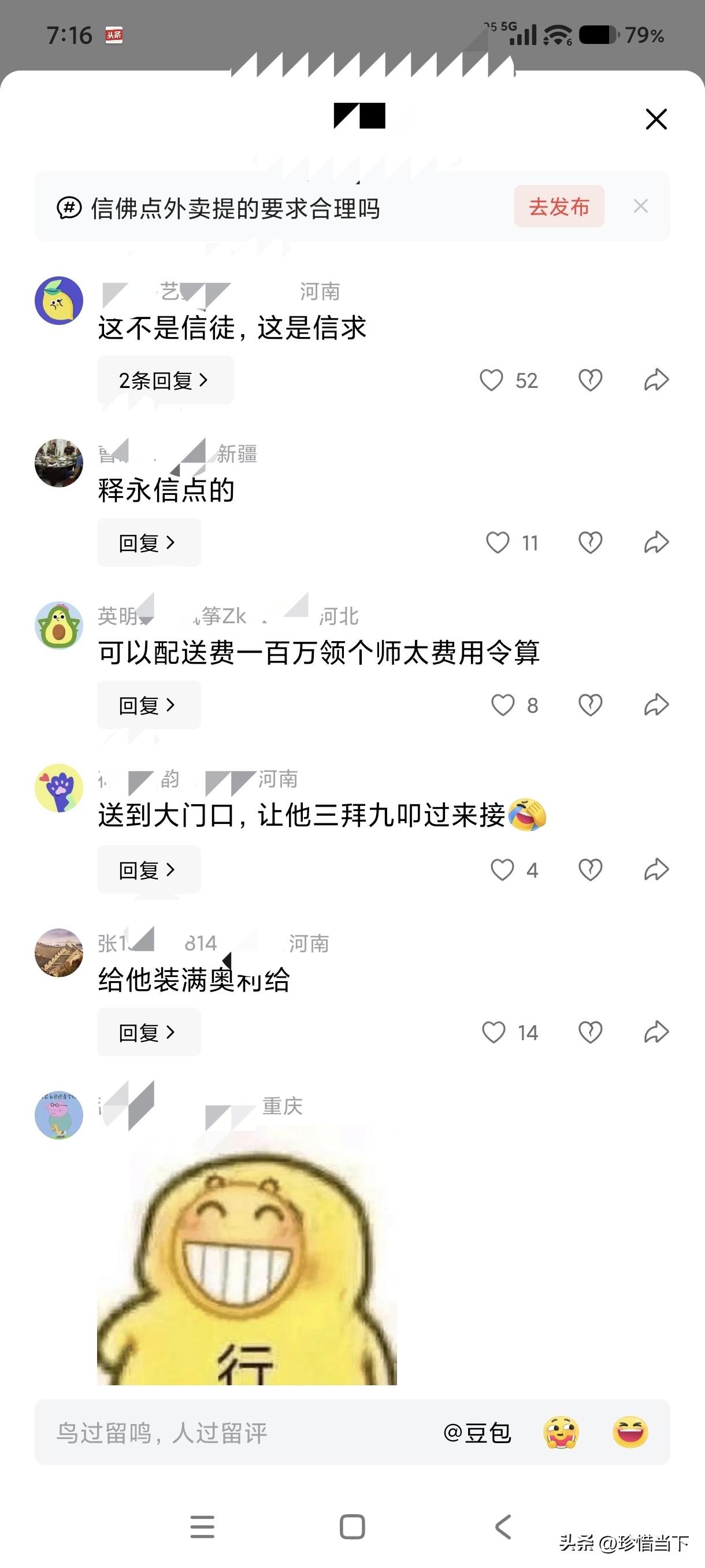 [大笑]差点笑岔气了!刚在网上刷到一个外卖订单的备注,备注是这么写的:【本人信佛,饭菜要用钵装,外卖小哥要剃头发,点上戒疤,三跪九叩送过来。最近不好化缘,施主多施舍点米饭。】 我看完第一反应:这位“信徒”,你怕不是佛祖派下来专门逗我笑的吧? 现在点外卖的花样真是越来越多了,有催快点的,有求多放辣的,有让帮忙带垃圾的,可这么“专业”要求的,我真是头一回见。 又是钵盂,又是剃度,又是戒疤,还要三跪九叩,你这哪是点外卖啊,你这是现场开光呢! 人家外卖小哥风里来雨里去,挣的是辛苦钱,不是来陪你演“西天取经”的。 真要是信佛,讲究的是心善、体谅人、不麻烦别人,而不是在这儿为难小哥,搞这些花里胡哨的形式主义。 不少网友看完都乐坏了: “建议小哥直接回复:贫僧赶路忙,没空给你演。” “别人点外卖是吃饭,你点外卖是想当场开个法会?” 说真的,开玩笑可以,但别拿自己的奇葩要求为难打工人。 尊重别人,比什么形式都管用。 你见过最离谱的外卖备注是什么?评论区甩出来,让大家一起乐一乐! 外卖订单图片 奇葩外卖备注 [免责声明] 素材均来自于网络,文章旨在传播正能量,无任何不良引导,如若真实性存在争议、事件版权或图片侵权问题,请及时联系作者,将予以删除。谢谢!