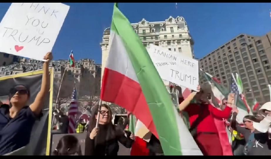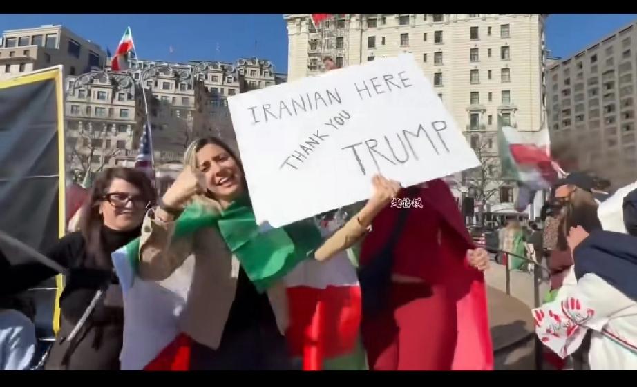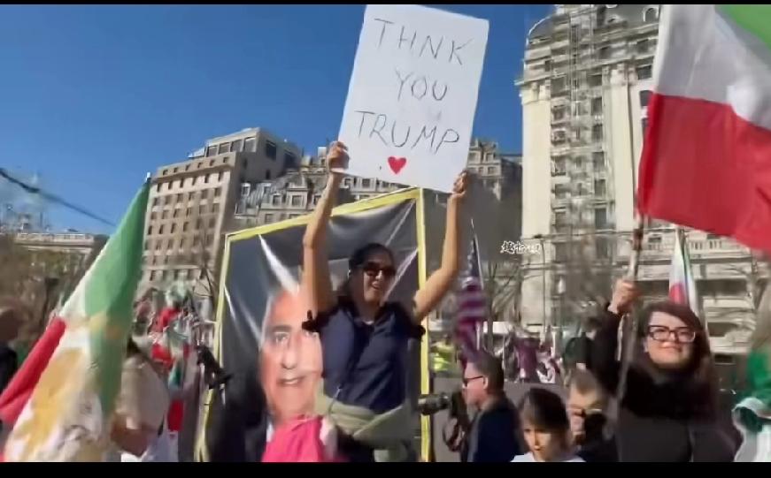 数以万计伊朗人在美国高举着谢谢你特朗普的标语。