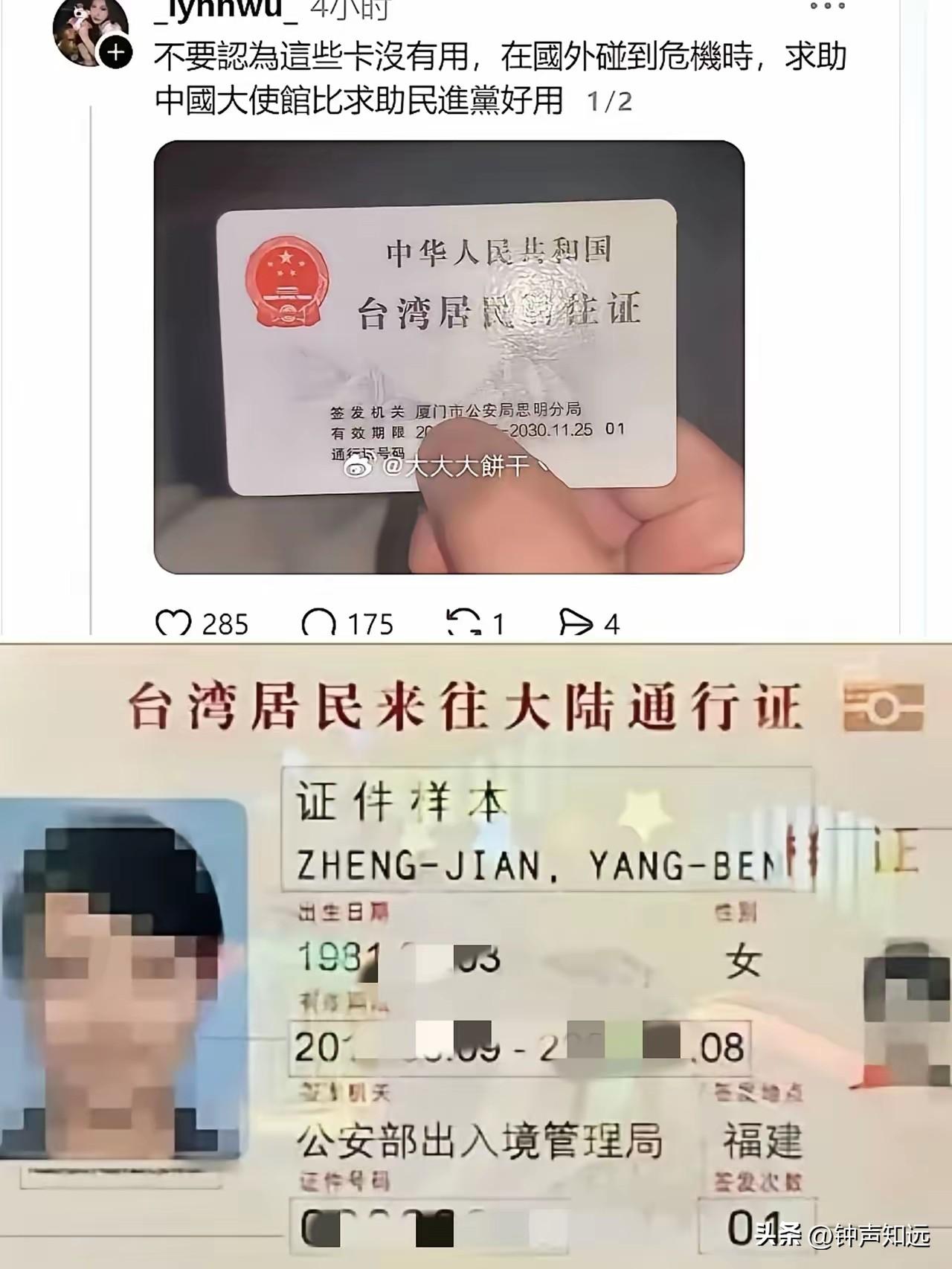 台湾博主:“台胞证随身带,平安与底气,一路都在”,结果被青鸟出征了。 有台湾博主终于认识到了台胞证的价值, 民进党不救他们,还不让他们跟大陆飞机回来,让他们留在安全地带[笑哭]。 这时候只有中国大陆能把台湾人安全带回家。 博主只是说了实话就被青鸟出征。 虽然有些台湾人是“有事钟无艳无事夏迎春” 而且也不敢保证他们回去之后不会继续骂。 但在绝对实力面前人总是慕强的,希望有越来越多的台湾人能真正觉醒,不要再被民进党继续骗了。