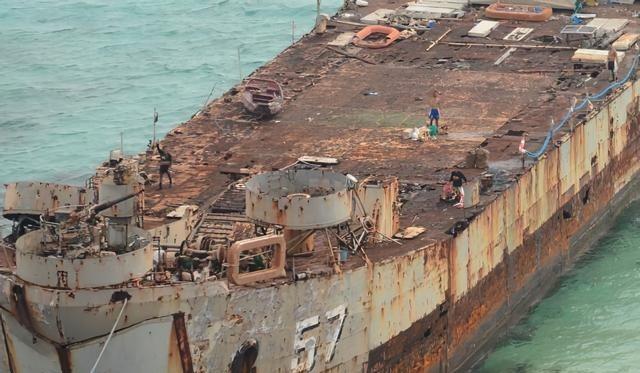 1999年,菲律宾的57号坦克登陆舰就来到南海,借口故障想以“坐滩”的方式窃占仁爱礁。到2021年,舰体早已破烂不堪,可怜的是在军舰上驻守的几个士兵,每天只能打鱼、斗鸡、发呆,有家不能回! 这艘船最早是1944年美国造的坦克登陆舰,编号LST-821,二战后期在美国印第安纳州船厂建成,下水后直接投入太平洋战场,主要干运输部队和物资的活儿,干完没多久就退役进了储备库。 1966年它又被拉出来服役,改名叫哈尼特县号,专门改装成支援越南战场的母舰,上面加了直升机平台和巡逻艇设备,在河口地带给美军提供补给和维修。1970年美国把船转给南越海军,改名美湫号,继续在湄公河一带跑。1975年南越政权倒台时,船上塞满难民,开到菲律宾苏比克湾的美军基地。1976年4月菲律宾海军正式接手,命名为马德雷山号,舷号LT-57,从此当成运输舰用,在菲律宾周边岛屿间运兵运货,一用就是二十来年。 到1999年5月,菲律宾把这艘老掉牙的船派到南海南沙群岛的仁爱礁。船上说机械出故障,船体漏水,没法继续航行,就这么直接开到礁盘浅滩上搁浅了。实际操作是故意安排的,目的是在礁上留下常驻存在,回应1995年中国占据美济礁之后的局面。 中国外交上立刻要求菲律宾把船拖走,菲律宾那边一口咬定船坏了修不了,就一直拖着不挪,还定期派海军陆战队士兵轮换驻守。 船上通常留着一名队长、医务兵、无线电员加上七八名士兵,总人数不超过十几个,带点轻武器,把那里当成前沿据点。菲律宾这么做,就是想造成实际控制的事实,盯上仁爱礁附近海域的渔业和潜在油气资源。 这些年过去,情况越来越清楚。中国允许菲律宾运基本食物和生活用品过去,但严格挡住钢筋水泥、电焊机这类维修材料。船停在热带海里,日晒雨淋加台风,海水盐分一天天腐蚀船体。油漆早就掉光,钢铁锈成一层一层,船身出现不少裂口和窟窿。 到2021年,整个舰体已经烂得不成样子,海浪直接从破洞涌进舱室,下层甲板常年泡水。 菲律宾海军陆战队士兵驻守在里面,日子过得相当艰苦。他们每天面对的就是那几个人,补给船来一次不容易,有时因为天气或者其他原因耽搁,就得靠自己下海捕鱼维持伙食。船上没啥像样的娱乐设施,士兵们轮流值班,检查固定位置,处理日常事务,剩下的时间基本就是坐着看海。 驻守轮换周期里,这些士兵回不了家,长期待在锈迹斑斑的舱室里。房间里只有简易床和蚊帐,卫生条件直接在船边解决。船体结构越来越不稳,菲律宾方面也承认需要加固,可因为材料进不去,修修补补始终跟不上腐蚀速度。 仁爱礁离菲律宾本土有上百海里,补给路线长,中国海警船在周边活动频繁,经常让运补行动受阻。 2021年11月就有一次,菲律宾补给船被水炮干扰后延迟,士兵们就靠钓鱼过日子。 菲律宾坚持不拖船,中国则反复强调这是非法占据,要求尽快移除。双方在外交和现场层面一直对峙,仁爱礁周边海域的巡航和补给成了常态摩擦点。到2021年为止,船还在原地,士兵们继续在破船上轮值,生活条件没根本改善。 这件事放在南海争端里,清楚显示出用老旧舰船制造既成事实的做法,最终把人和船都拖进了长期消耗的境地。