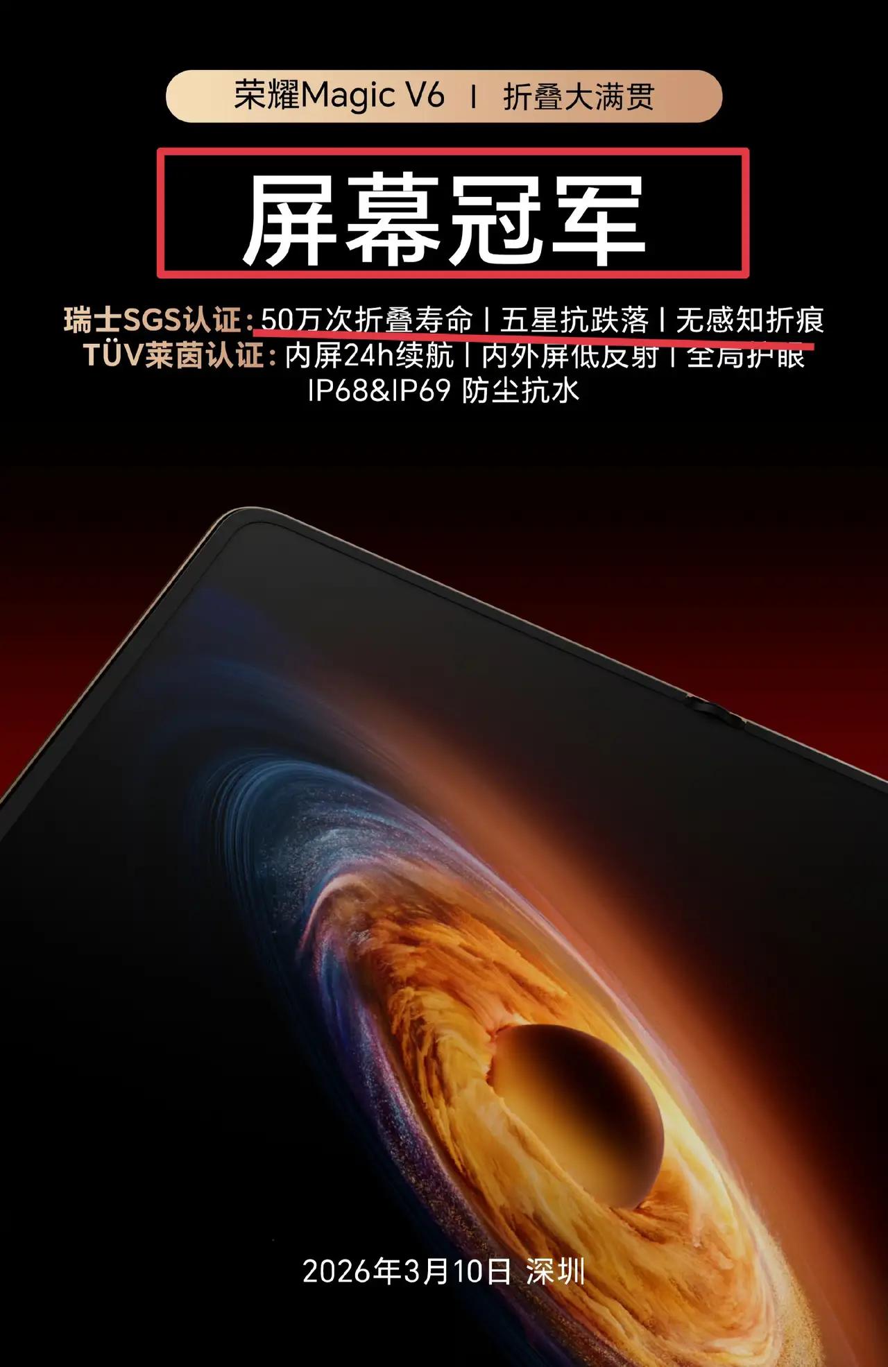 荣耀这次宣传有点猛,直接称Magic V6是屏幕冠军,不少网友都在讨论。 这个“屏幕冠军”,到底是折叠屏里的冠军,还是包含所有手机一起比,大家看法不一样。 另外它还有几个亮点: - 折叠寿命达到50万次,每天折100次,能用十几年 - 宣传无感知折痕,很多人关心,折叠屏最大的痛点是不是真解决了 参数看着很顶,你觉得这款折叠屏,算得上真·屏幕冠军吗?