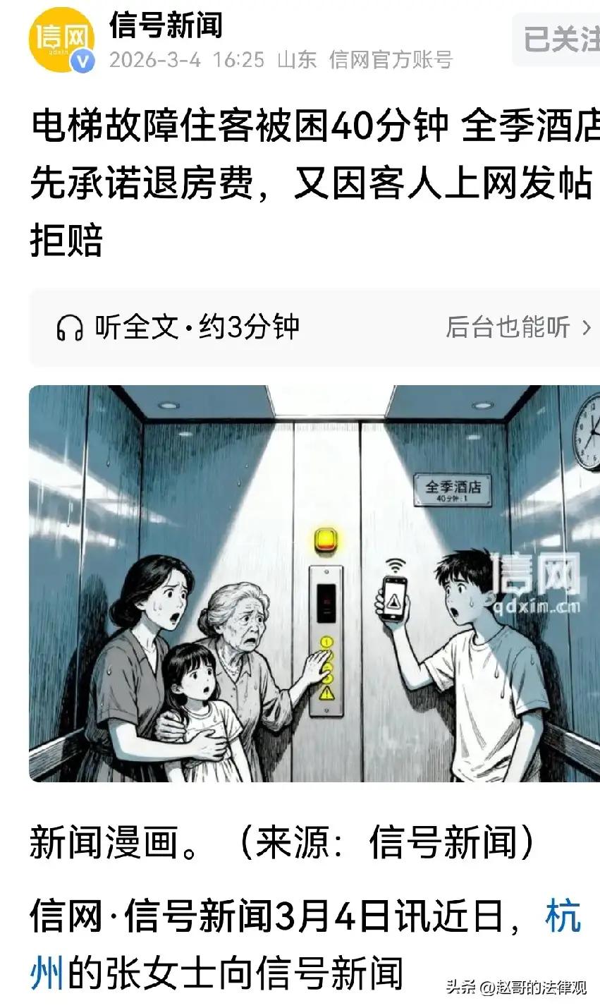 627元的“封口费”与关不住的真话 今儿咱们不聊那风花雪月的闲情逸致,也不谈那庙堂之高的宏图伟业,单说一桩发生在江城武汉的“电梯惊魂”。这事儿听着让人脊背发凉,更让人啼笑皆非——一家四口高高兴兴来旅游,谁曾想,这“开门红”变成了“闭门羹”,差点把老命交代在那方寸铁盒子里! 话说那日,张女士一家四口,老的老,小的小,兴冲冲地入住了全季酒店。谁料,这脚刚迈进电梯,那玩意儿就跟中了邪似的,突然“罢工”!上不着天,下不着地,四面漆黑,活脱脱一个“移动铁棺材”。更要命的是,那紧急呼叫按钮成了摆设,手机信号更是“人间蒸发”。一家子连惊带吓,尤其是那外婆和母亲,吓得胸闷气短,抖成一团,这哪是旅游?简直是“渡劫”!足足煎熬了40多分钟,这“铁棺材”才终于开门放人。 事后,酒店方面也觉得理亏,主动提出赔两间房费,共计627.4元,张女士想着事儿已至此,也就点头答应了。可谁曾想,这酒店竟玩了一手“仙人跳”!只因张女士事后把这倒霉事儿发到了网上,酒店立马翻脸不认人,声称“承诺作废”!好家伙,这627元原来是“封口费”,吃了苍蝇还得闭嘴,天下哪有这样的道理? 这便是咱们今天要说的“大健康”意识。真正的健康,讲究“内外双调”。外在,我们要强健体魄,防范于未然;内在,更要有一股子“硬气”和“正气”。面对不公,若为了蝇头小利就选择“忍气吞声”,那心里的郁结便是最大的病灶。敢于发声,维护权益,这股子“较真劲”,才是治愈社会顽疾的良药。 我们要感恩那些敢于说真话、敢于维权的普通人,是他们让劣质服务无处遁形,让诚信二字不至于沦为笑话。 愿天下旅人皆能住得安心,行得顺心。 愿你我皆安康,前程皆似锦!
