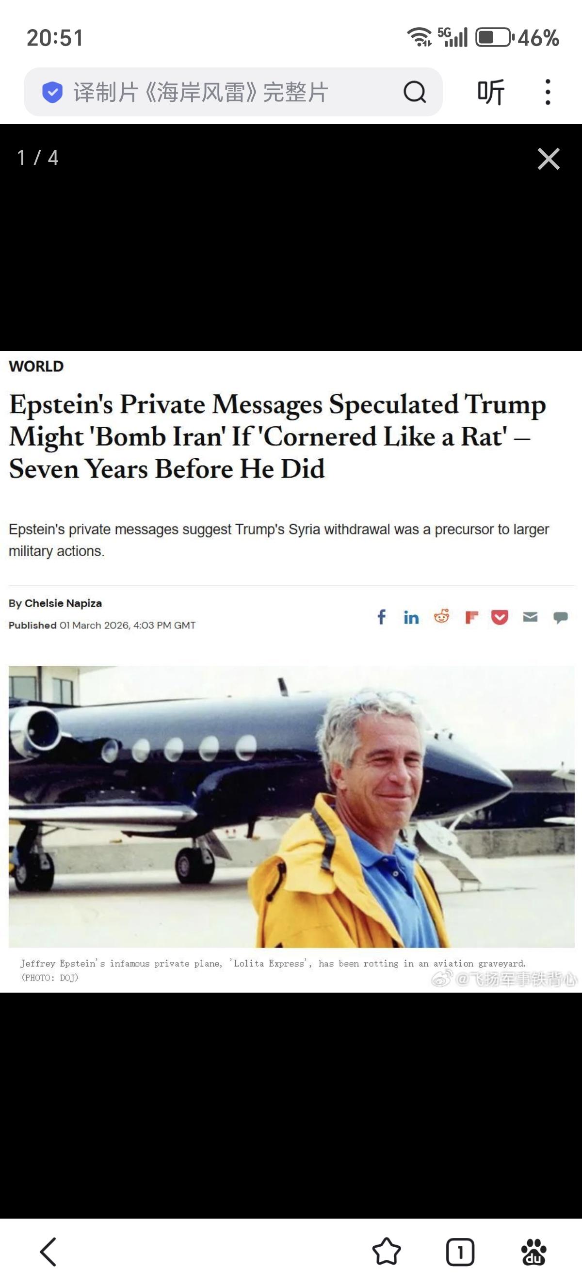 英国《国际商业时报》在爱泼斯坦的信件中发现了一段残缺的内容,其中他暗示,面临政治压力的唐纳德·特朗普可能会以轰炸伊朗作为“大规模转移视线行动”。 早在7年前,爱泼斯坦的私人信息就推测,如果特朗普“像老鼠一样被逼到绝境”,他可能会“轰炸伊朗”。 报道指出,这些消息来自爱泼斯坦于2018年12月20日发出的私人iMessages,后来作为司法部公开的爱泼斯坦档案的一部分发布。