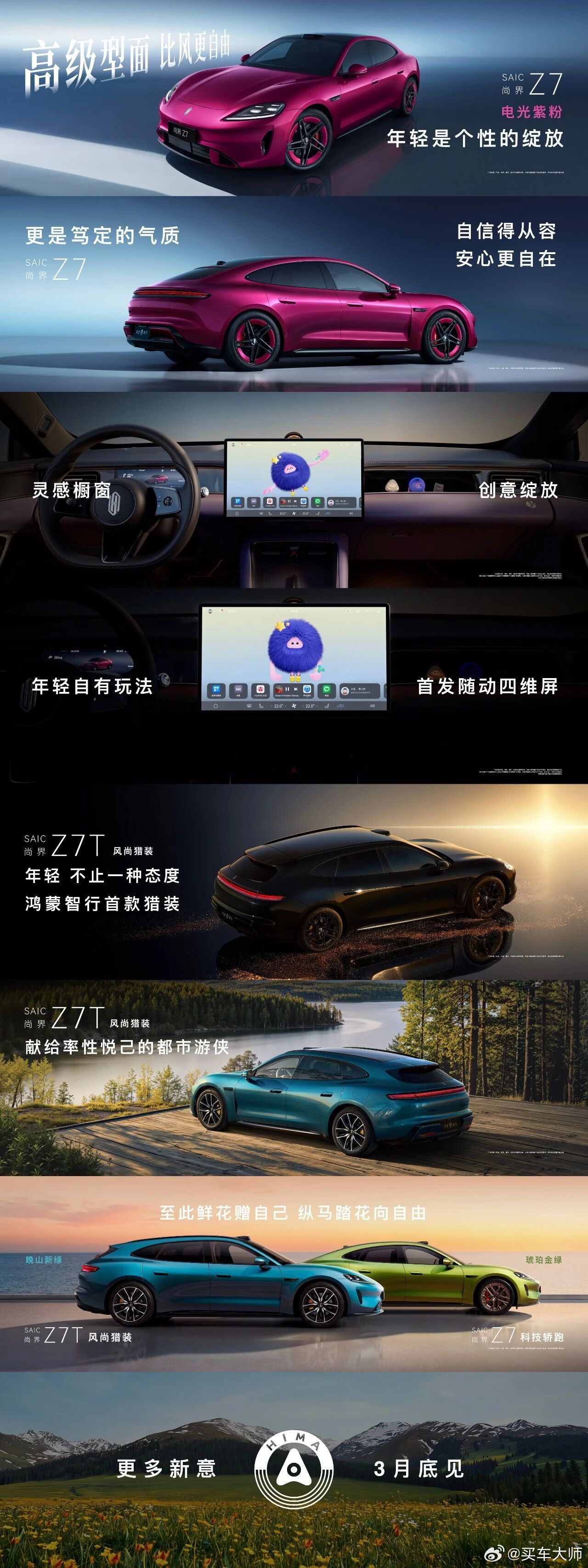 ⭐四、尚界Z7&Z7T将同步揭晓,定档3月底,预计是华为春季发布会上,届时不光是鸿蒙智行首款猎装车尚界Z7T到来,更有更多配色以及首发随动四维屏这类的“黑科技”玩法落地;
