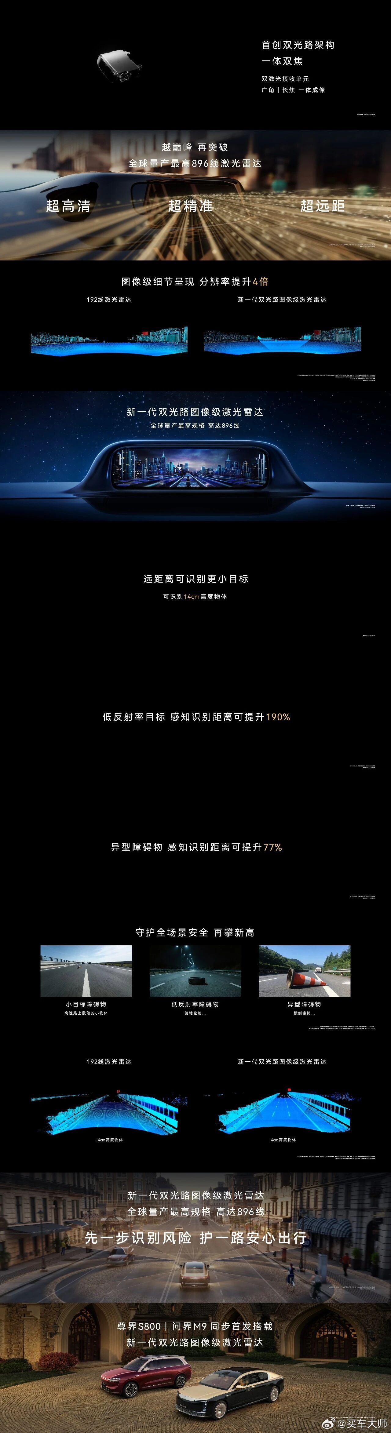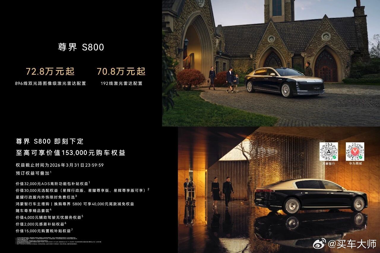 ⭐三、尊界S800与问界M9同步首发搭载全球量产最高规格896线新一代双光路图像级激光雷达,装车后的尊界S800售72.8万元起(192线激光雷达配置70.8万元起)、装配该款激光雷达的问界M9售47.98万元起(192线激光雷达版售46.98万元起),两款旗舰均已开启预定,同步享一系列预定权益;