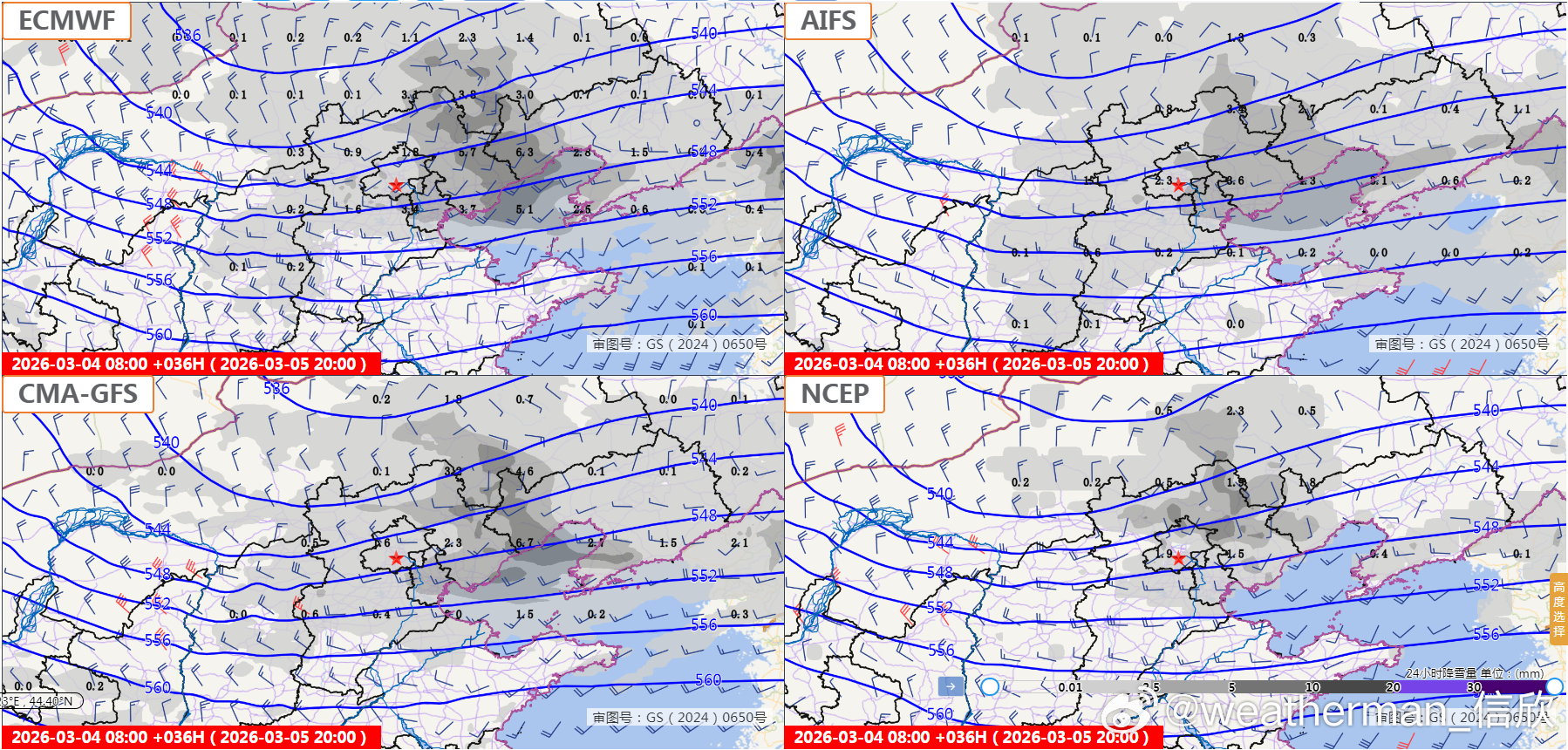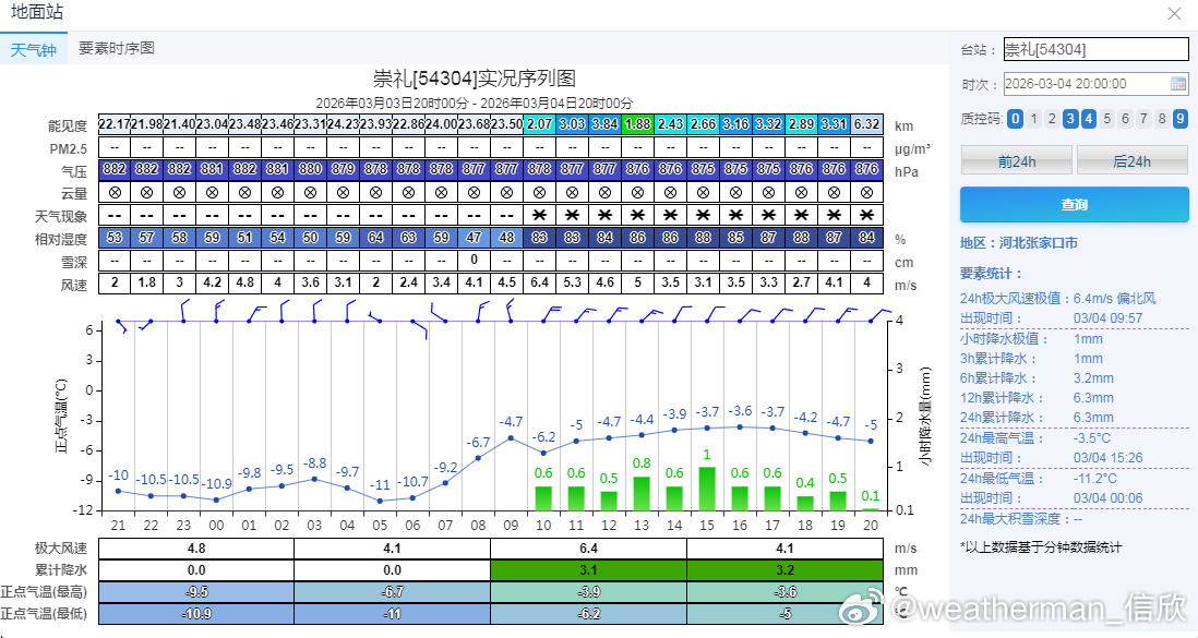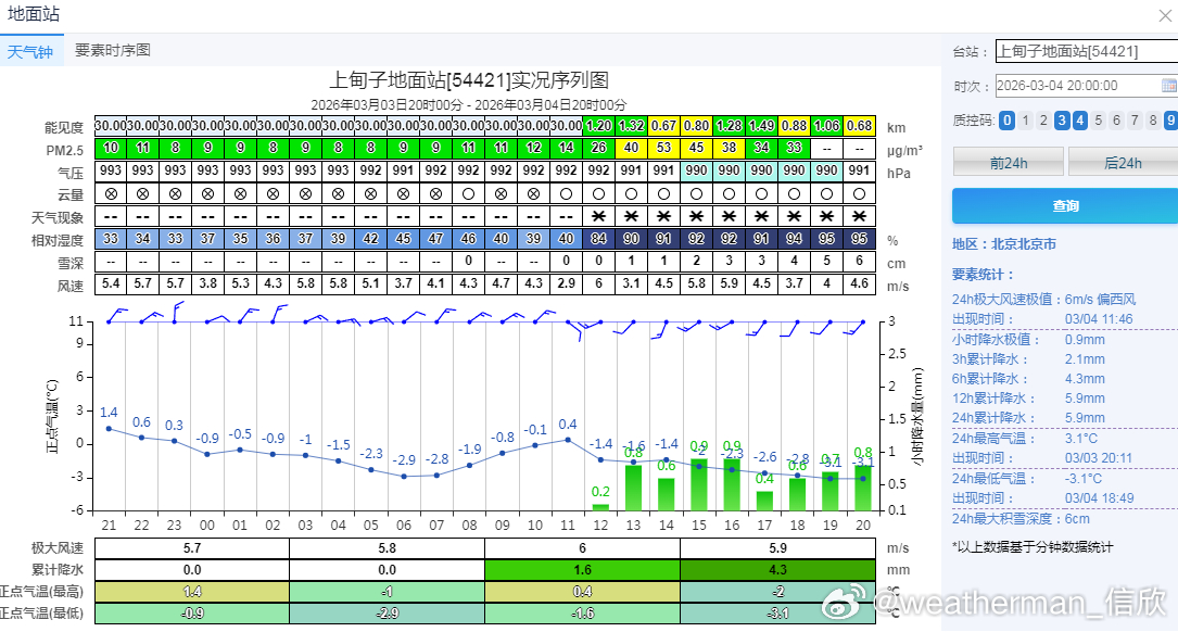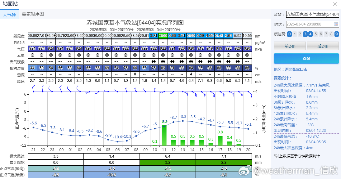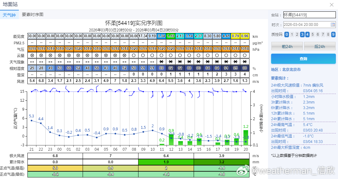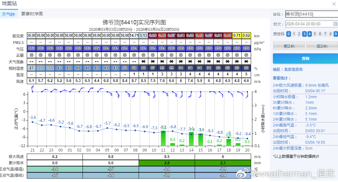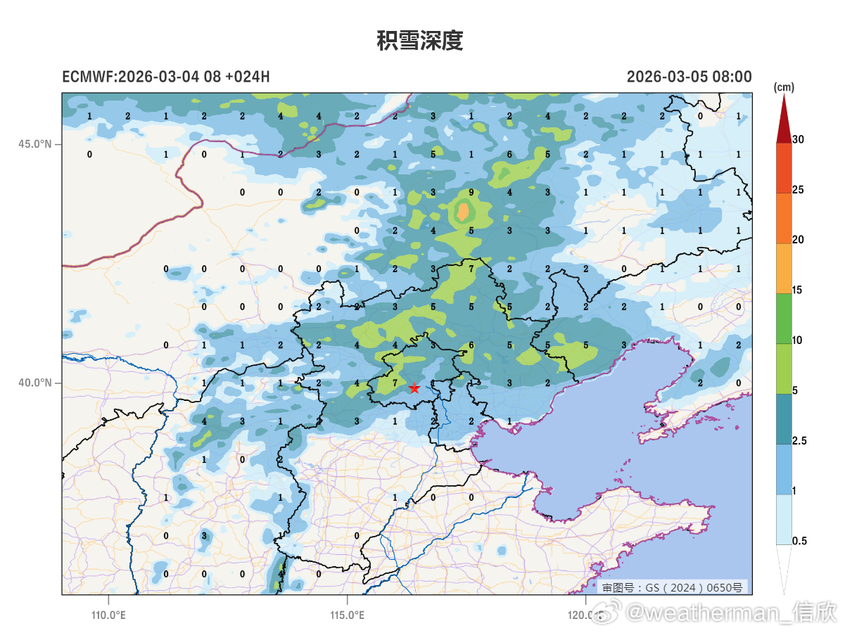 【北方降雪】今天河北北部、北京北部出现了明显降雪。河北崇礼、赤城,北京延庆佛爷顶、怀柔、密云上甸子,降雪量(化成水)在5毫米以上,出现大雪,并且有5厘米左右的积雪(昌平5.2毫米雪为主,但混了一些雨夹雪,考虑雪还在下,也可以算为大雪)。
