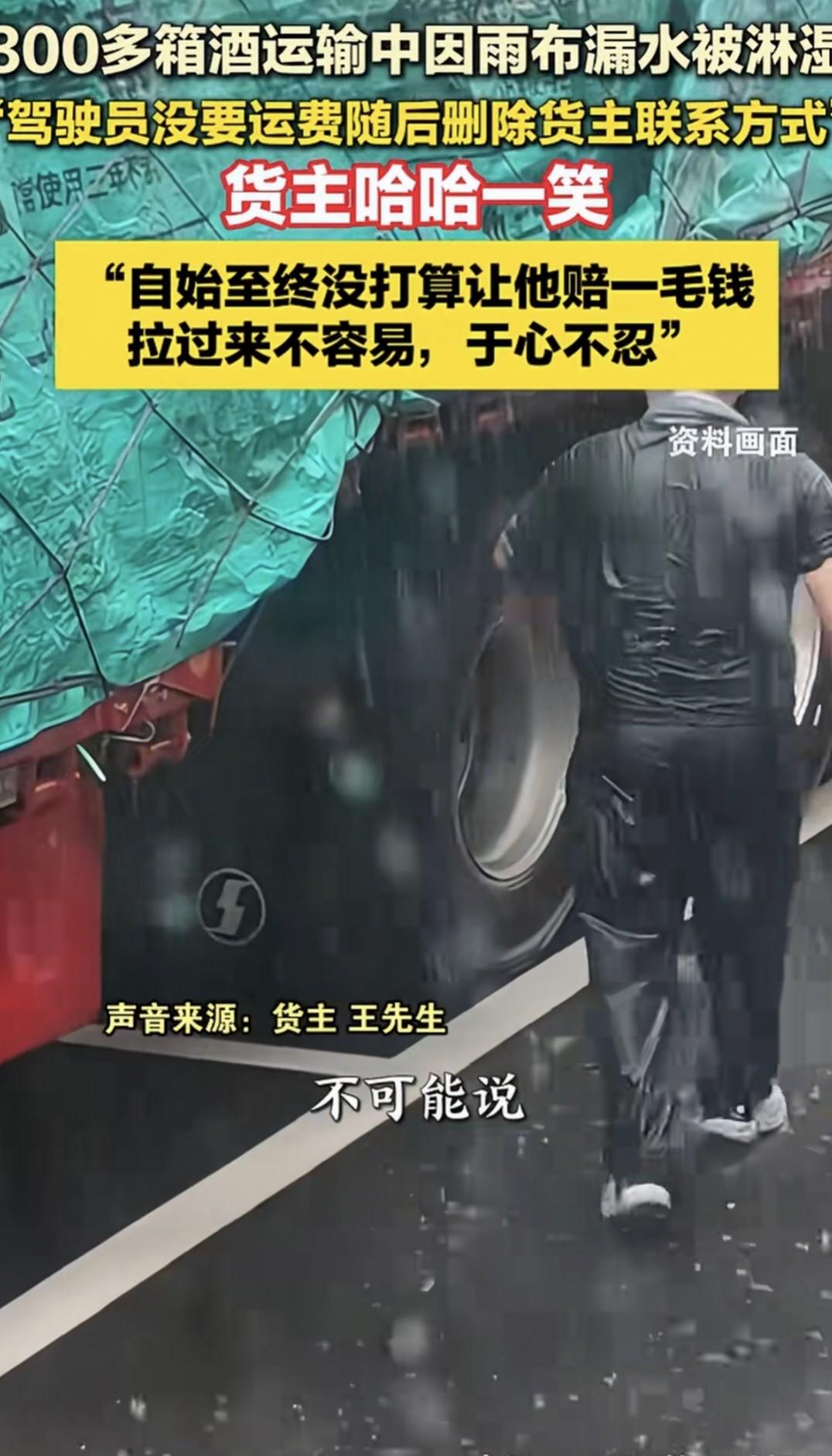 300箱酒泡在水里, 司机删微信跑路, 货主却说不赔也行。 那天雨下得挺大,货车上的雨布破了个口,345箱酒有300多箱被淋透。 纸箱子一碰就软,酒瓶倒是没漏,但卖不出去了。 司机拉完货当晚就把货主微信删了,一句解释没有。 货主王先生倒没急着骂人,只说“大半夜烧着油拉过来,挺不容易”,运费340块也没收。 这事看着是赔不赔钱的问题,其实不是。 司机怕赔不起,货主怕扯皮耗时间,两边都卡在“讲理没用、走法太累”的路口。 阜阳那边刚出过类似事,车没坏,货湿了,最后靠熟人说和才摆平。 宿州这个,到现在也没人起诉,也没人发声明。 雨停了,酒箱还在仓库地上堆着,有的箱子底下开始发霉。 300箱酒泡在水里,司机删微信跑路,货主却说不赔也行。
