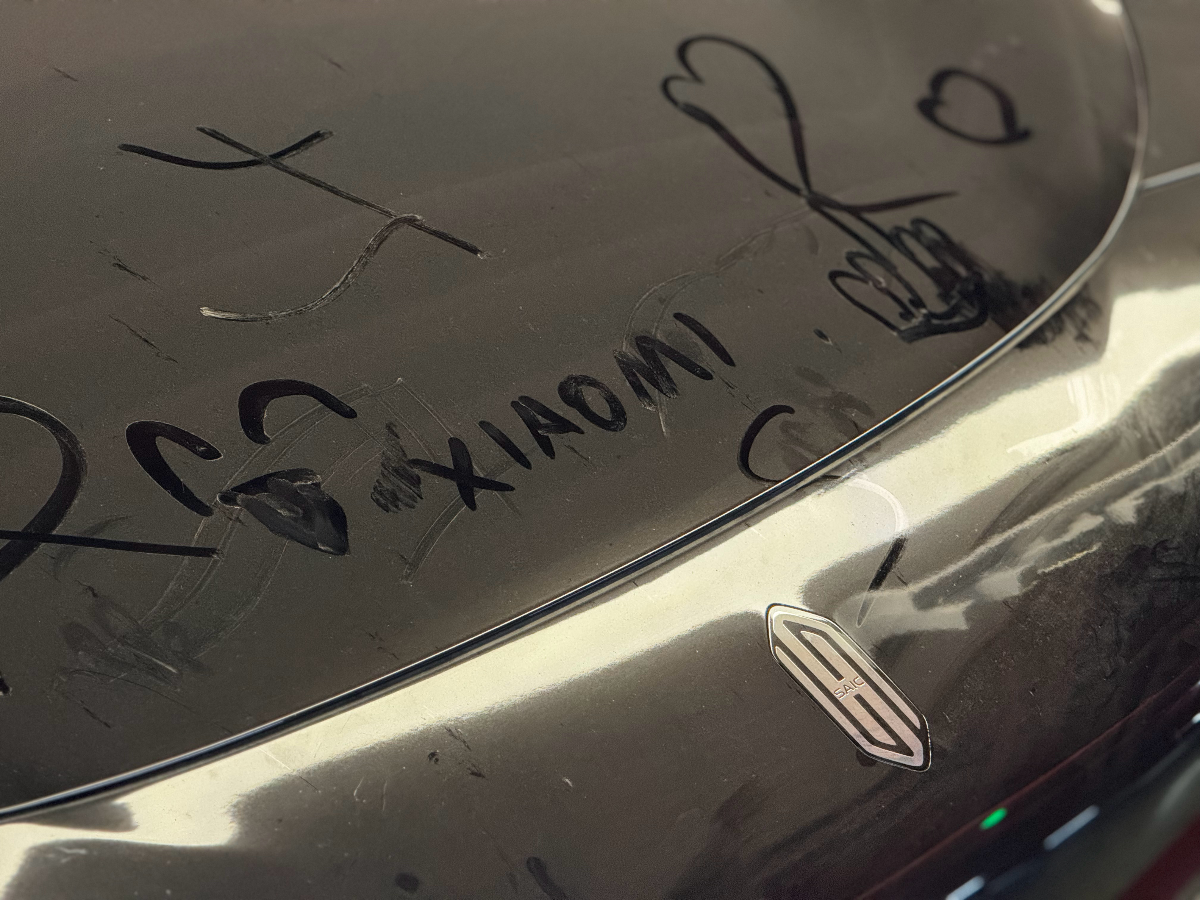 跟哥们顺路吃口饭,路过HUAWEI门店的试驾车…定睛一看,谁在这儿写了个“XIAOMI”?!这不是贴脸开大吗???HUAWEI汽场全开小米