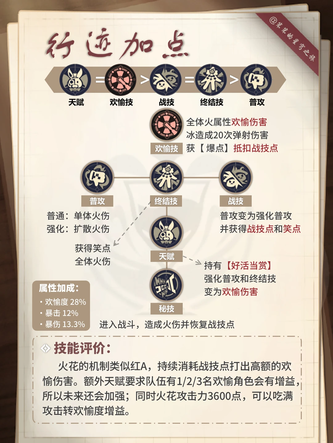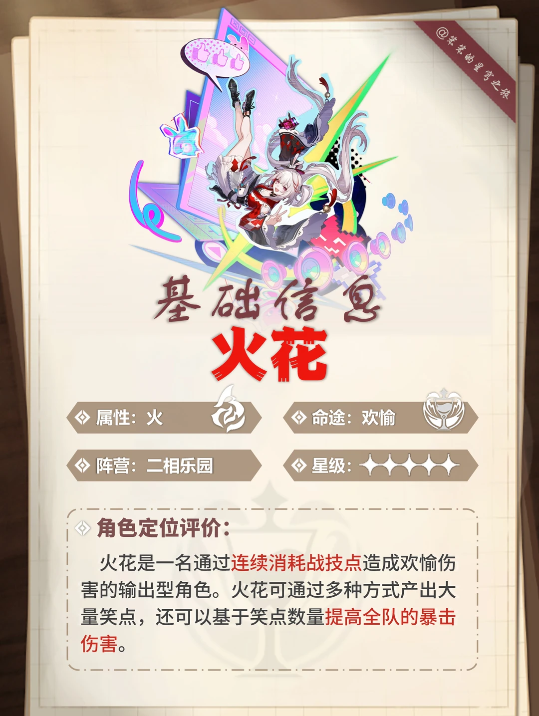 🐱大家好,我是笨笨的铲屎官 今天给大家带来的是火花的培养攻略 火花作为第一个欢愉主C 优先建议大家在有爻光的前提下抽取 上半爻光不会下线 花火+爻光+火花,作为欢愉策略卡 0+0就可以用相当一段长的时间