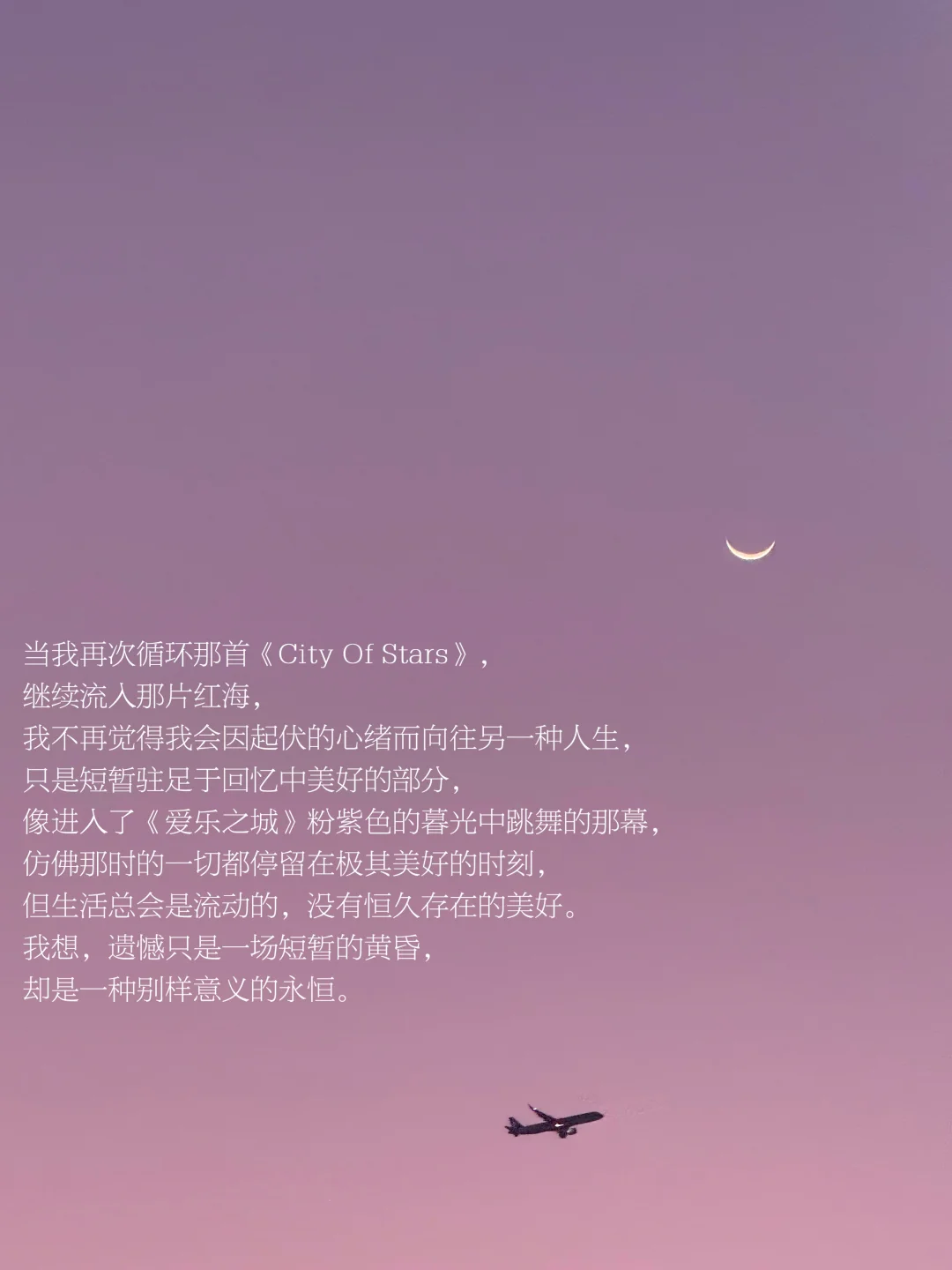 当我再次循环《City Of Stars》,我只是短暂驻足,像进入了他们在粉紫色的暮光中跳舞的那幕,仿佛一切回忆停留在美好的时刻。我想,遗憾只是一场短暂的黄昏,却是别样意义上的永恒。