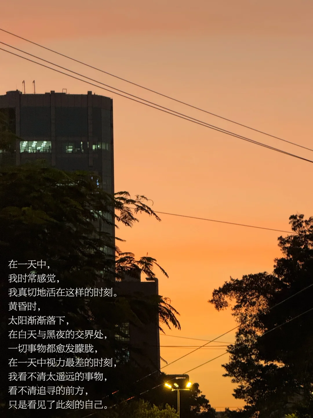 当我下班后坐在返程的车上时,透过车窗看见与我一样疲惫的面孔,内心漂浮在偌大的城市森林中。在一天中,我感觉自己真切活在此刻。黄昏时,太阳渐渐落下,在白天与黑夜的交界,一切事物都愈发朦胧,我看不清太遥远的事物,只是看见了自己。