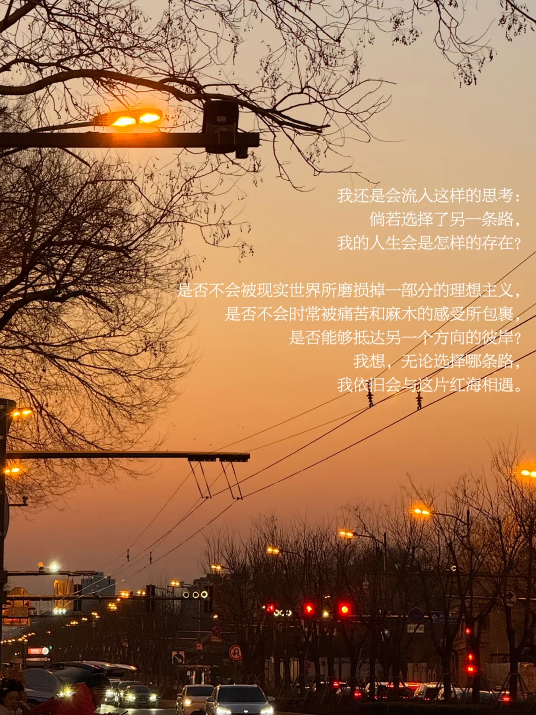 我还是会思考:倘若选择了另一条路,我的人生会是怎样的存在?是否不会被现实世界所磨损掉一部分的理想主义,是否不会时常被痛苦和麻木的感受所包裹,是否能够抵达另一个方向的彼岸?我想,无论选择哪条路,我依旧会与这片红海相遇。