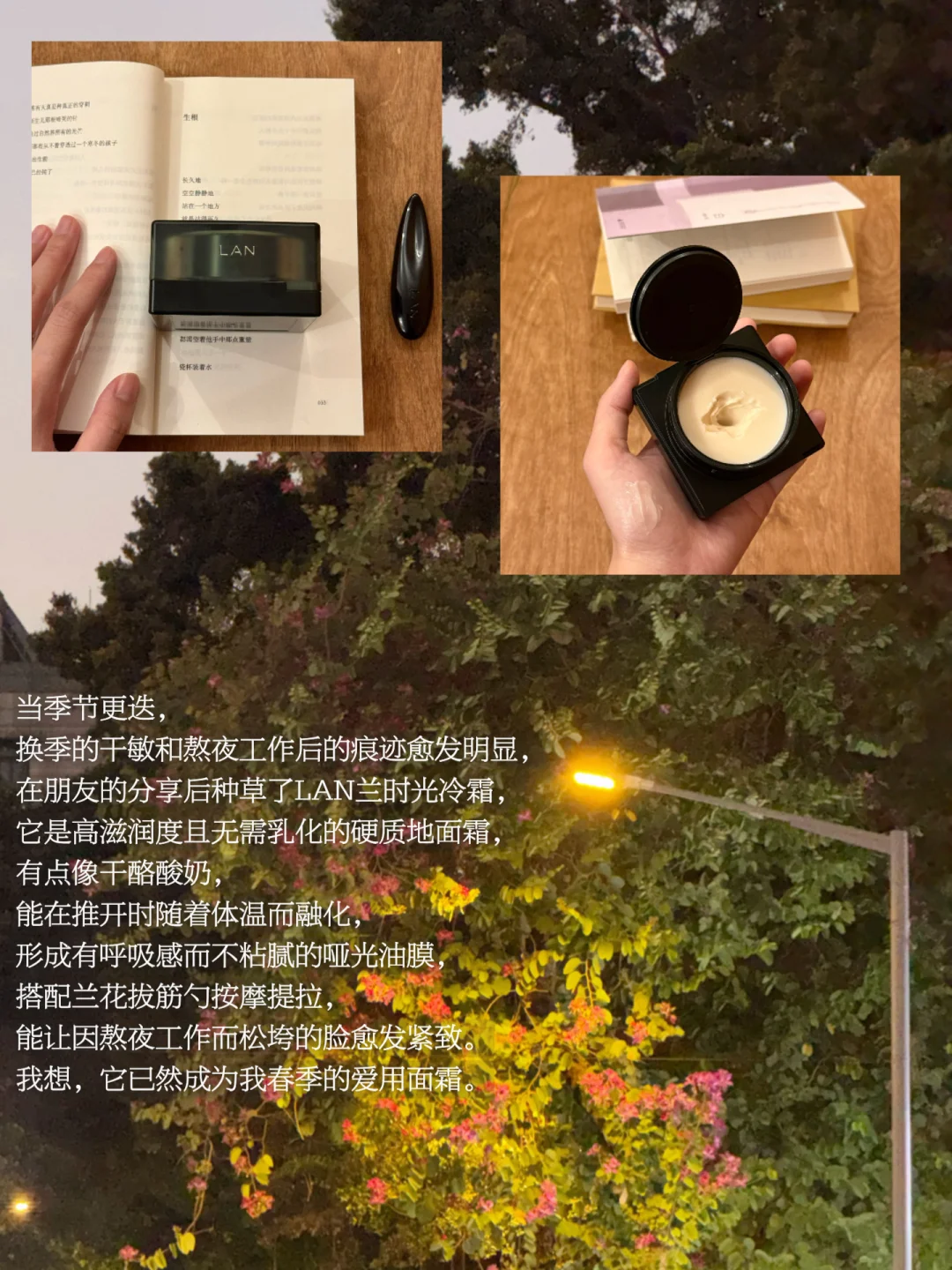 当季节更迭,换季的干敏和熬夜工作后的痕迹愈发明显,在朋友的分享后种草了LAN兰时光冷霜,它是高滋润度且无需乳化的硬质地面霜,有点像干酪酸奶,能在推开时随着体温而融化,形成有呼吸感而不粘腻的哑光油膜,搭配兰花拔筋勺按摩提拉,能让因熬夜工作而松垮的脸愈发紧致。我想,它已然成为我春季的爱用面霜。