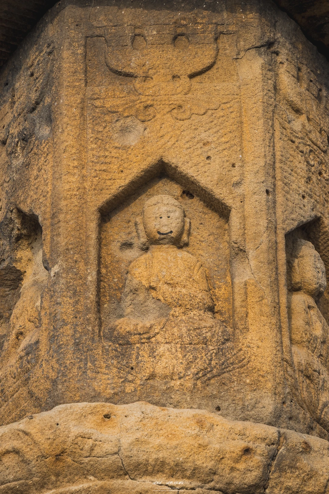 说实话,这塔放在野外绝对是不起眼中的不起眼,要不是立在山顶,想找到都不容易,而这造型第一眼看去像极了夜市里的烤肠,自带几分喜感,而离近观察还有更喜感的发现:这佛像的脸怎么成简笔画了?这当然不是古代工匠的杰作,而是不知出自哪个熊孩子之手,给这国保增加上了来自于后世的笔触