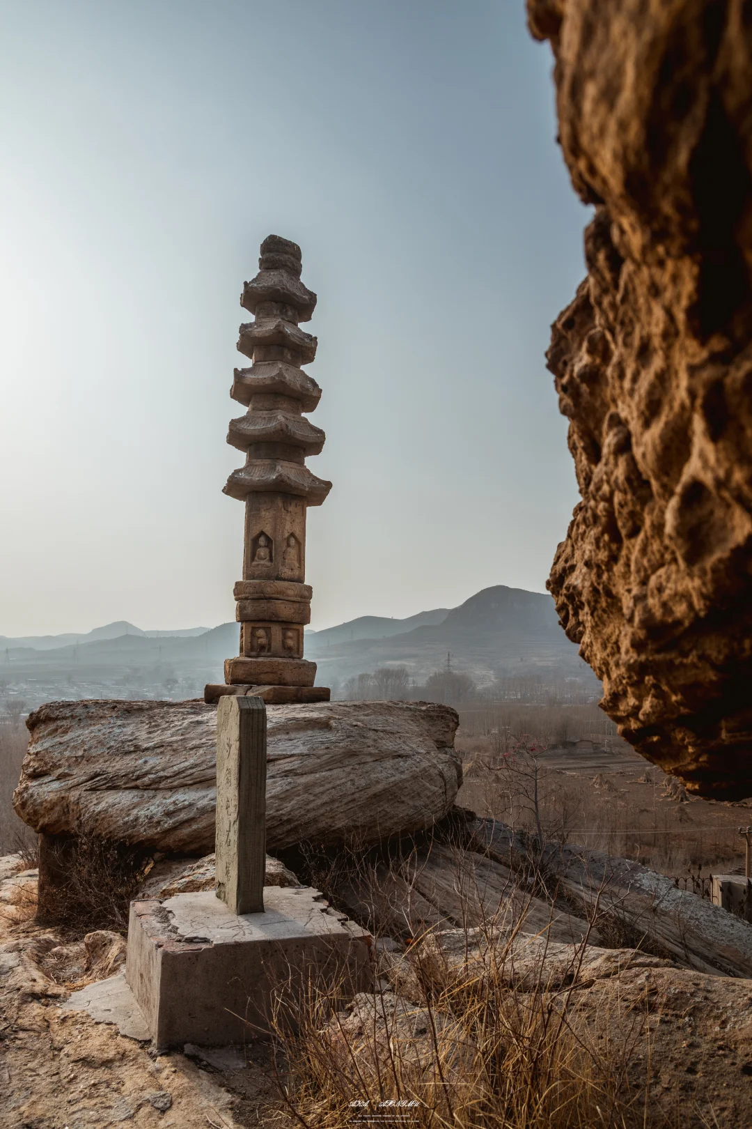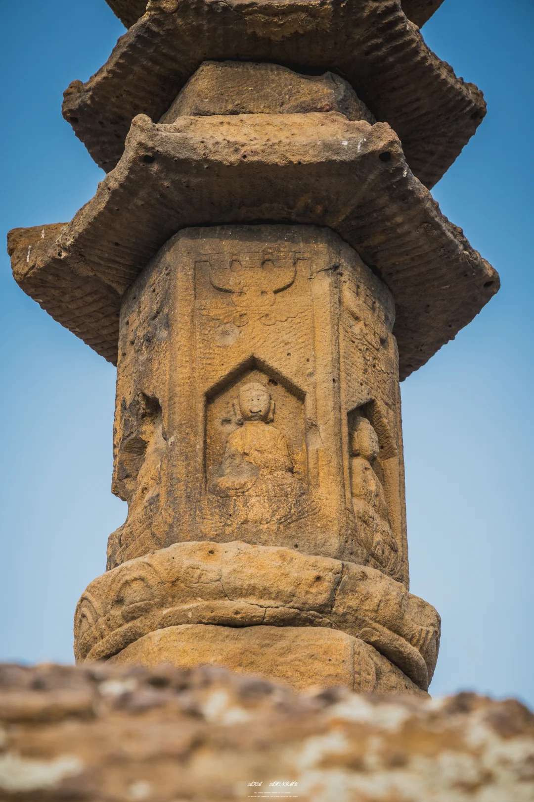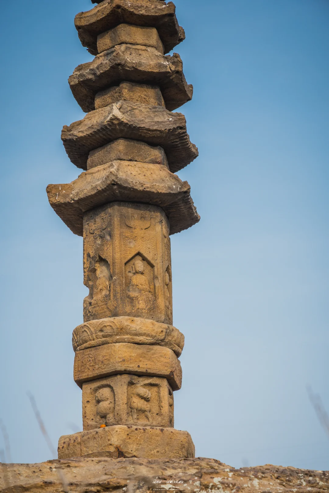看起来不起眼的它建于金章宗泰和六年,也就是公元1206年,距今已有八百多年,整座塔以当地褐色花岗岩就地凿刻而成,与山岩浑然一体,整塔虽高不足五米,却精工细作:须弥座上石狮镇守,仰莲承托塔身;六角塔身各开一龛,原供奉坐佛,可惜岁月侵蚀与人为损毁,多尊佛像面目残缺,佛头不存。五层密檐层层收分,檐角曾悬风铃,风过有声,如今只剩圆孔,静对空山。