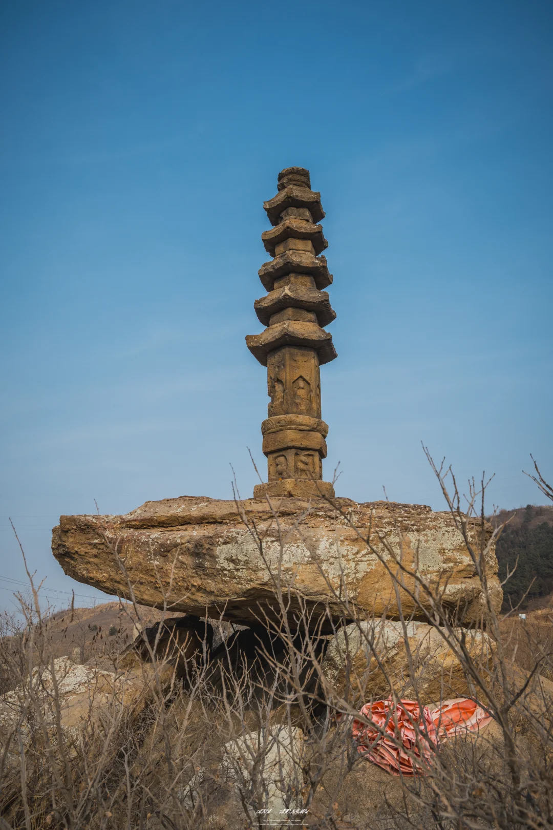 作为东北地区现存唯一一座金代密檐式石塔,并位列全国重点文保单位,它的价值不言而喻。只是长期身处山野,保护条件有限,风化、残损,甚至被乱涂乱画,都让这座古塔带着一身沧桑,我在塔下与带着“笑脸”的佛像对视良久,竟哑然失笑,世人以形相拜佛,认为眉目庄严才是法身,却有道是佛本无相,若见诸相非相,即见如来,这简陋的笑脸何尝不是一种度化呢
