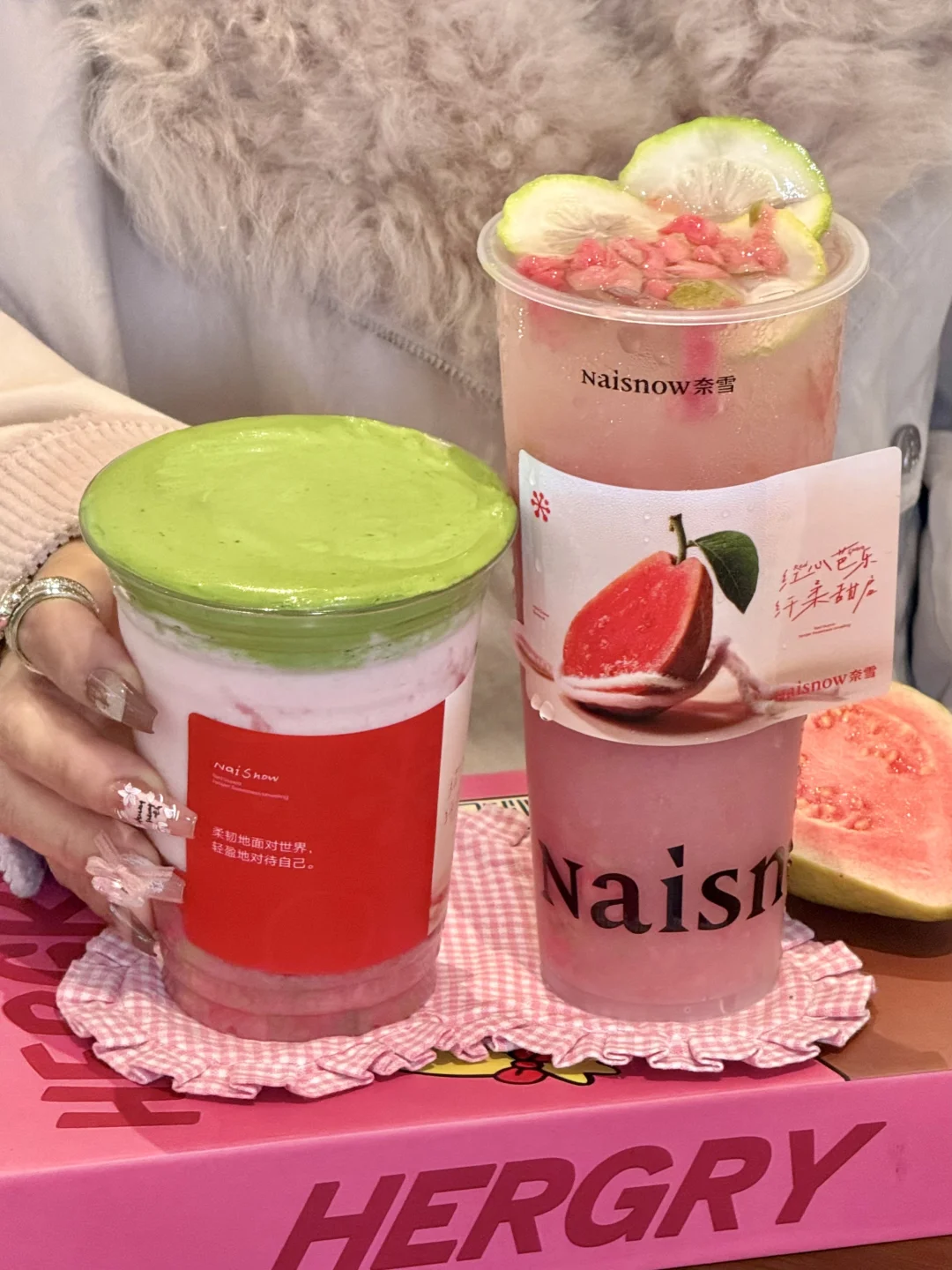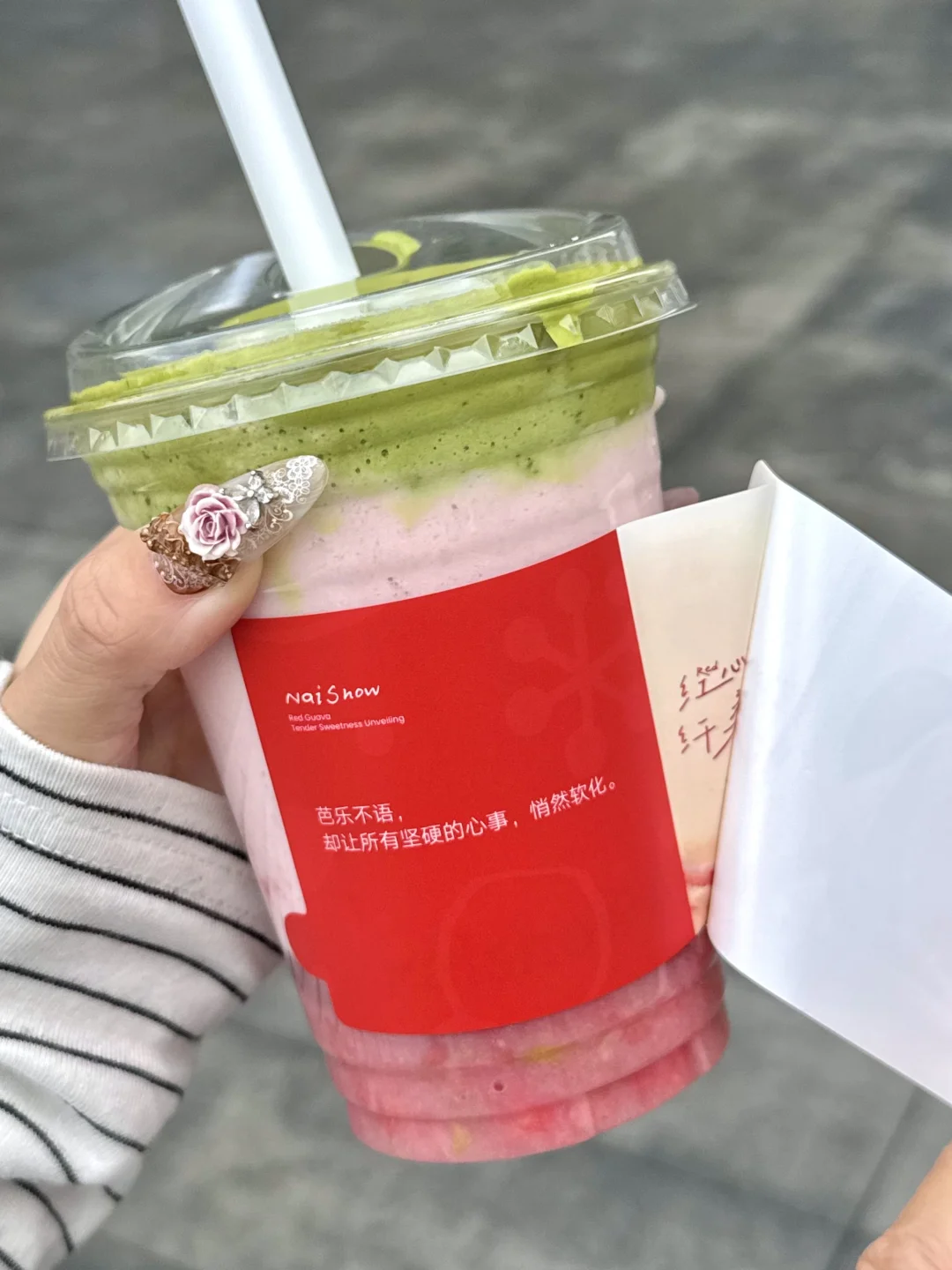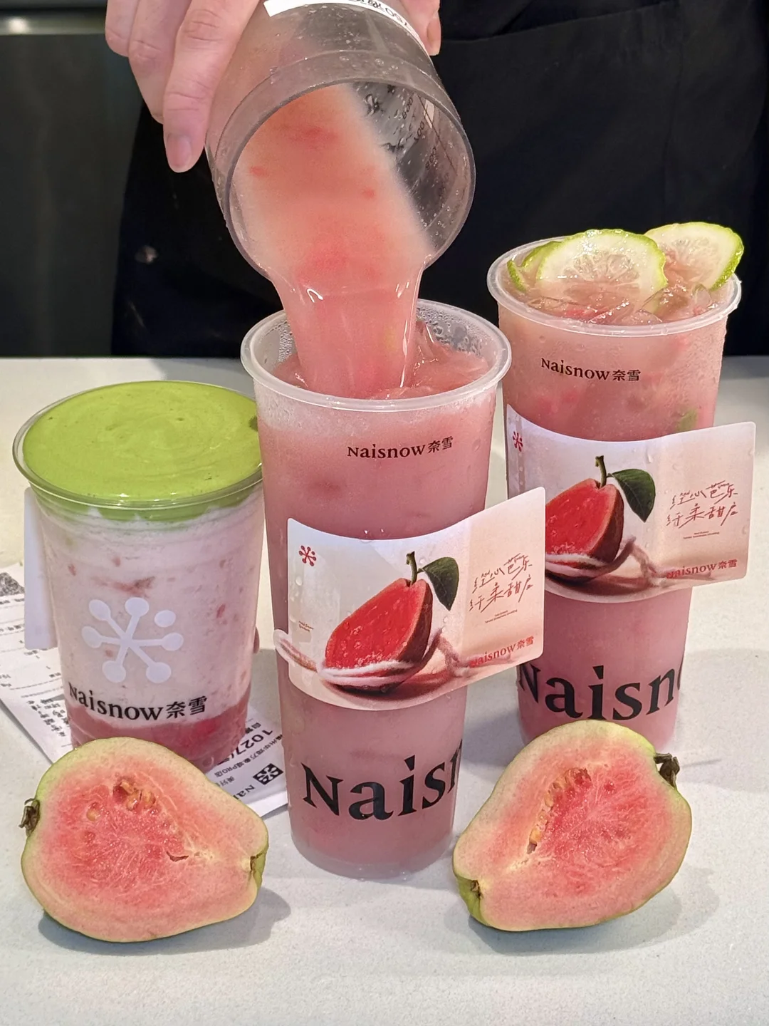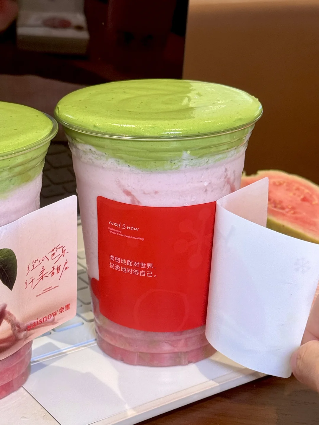 好喝哭!!奈雪你有点太会做芭乐…… 春天和芭乐绝配!!!!芭乐和我们女孩子绝配!!! 这点也是奈雪精准捕捉到,杯贴文案就这样拿捏我的泪点,不知道的还以为我馋哭了...... 浓抹芭乐果昔口感好绝啊!茶香奶香果香就这样层层叠叠!微苦的抹茶奶盖简直神中神!! 软糯香甜的芭乐果肉和鲜奶碰撞出清甜芭乐果昔[色色R]还能嚼到好多果肉!每喝一口都有幸福buff叠加[喝奶茶R][喝奶茶R] 香柠芭乐冰茶也是清爽的飞起!芭乐搭配柠檬双重果味暴击!! 混着她家顶配茉莉初雪,喝完嘴里还留着淡淡芭乐茶香~爱薯了!