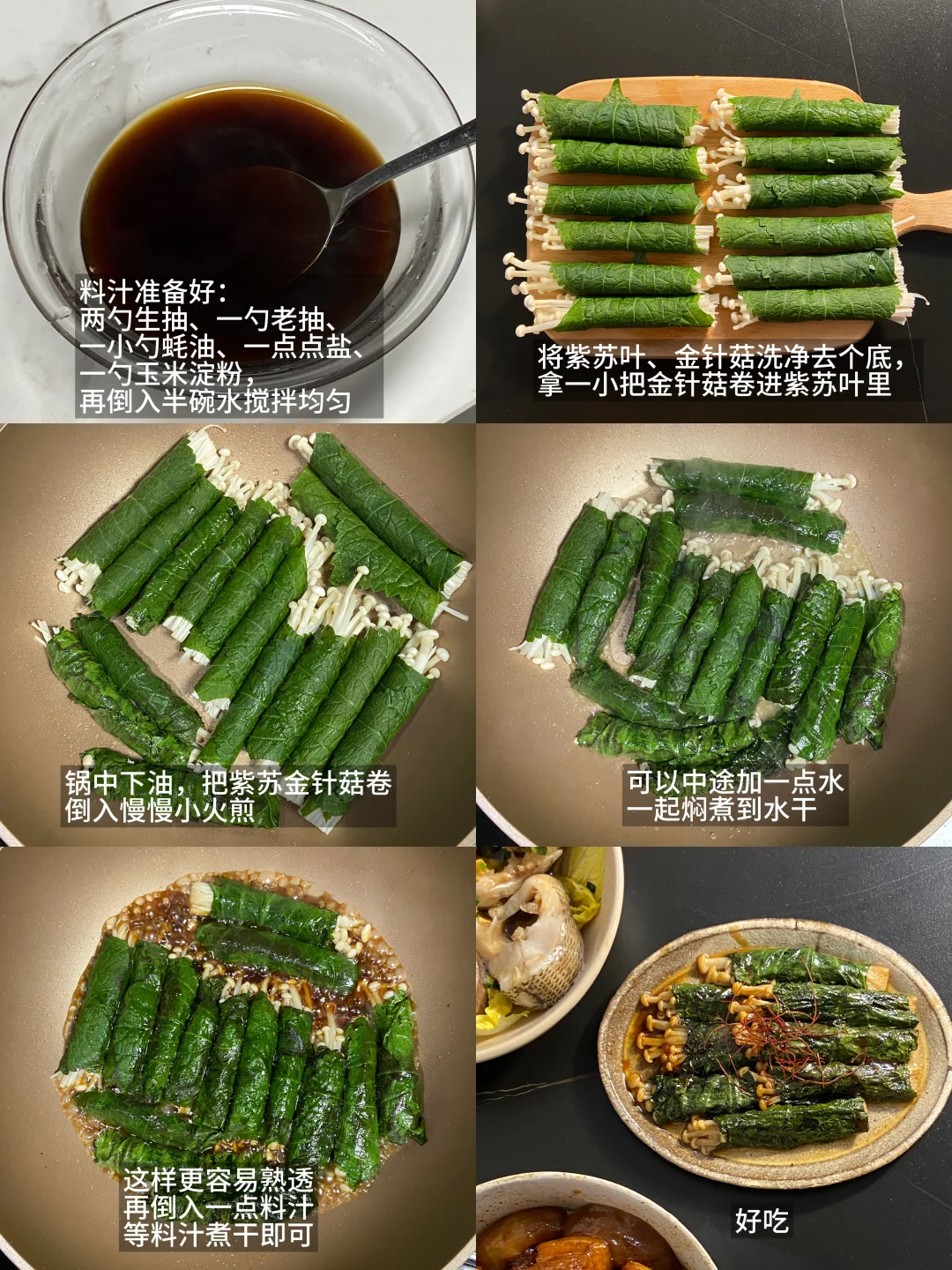 紫苏很适合卷肉馅、虾滑,卷起来味道不错,金针菇煮熟会慢慢出汁缩小,可以稍微煮干一些好吃